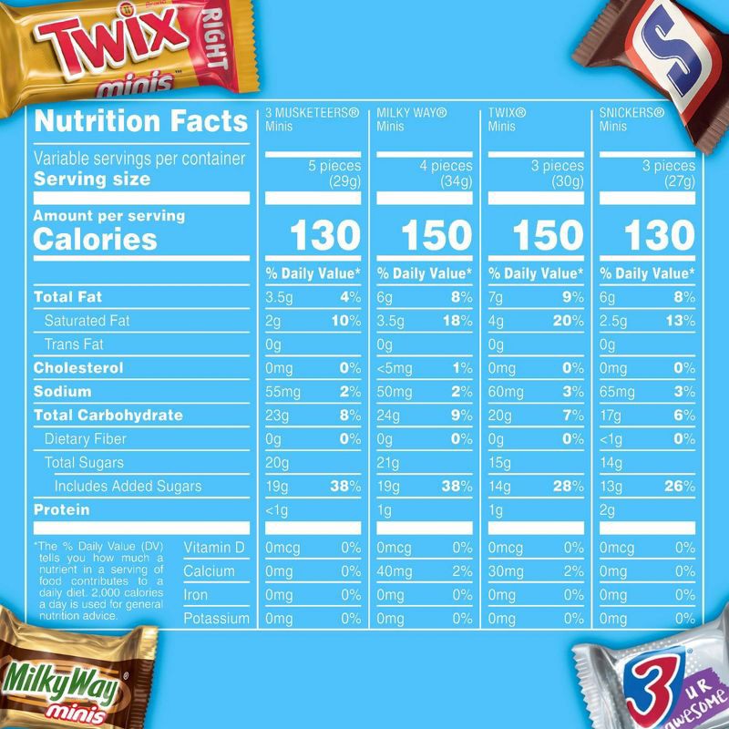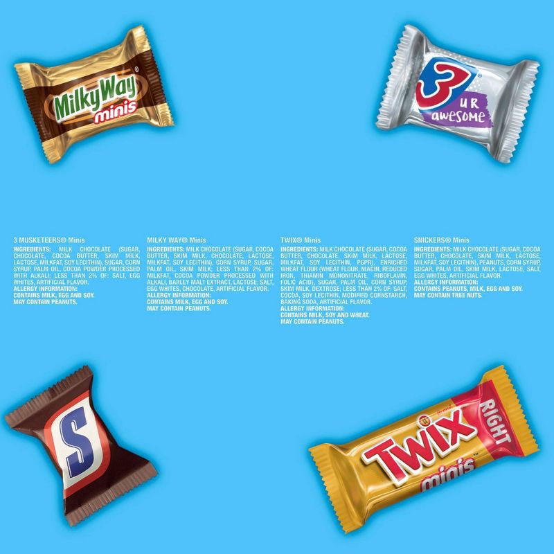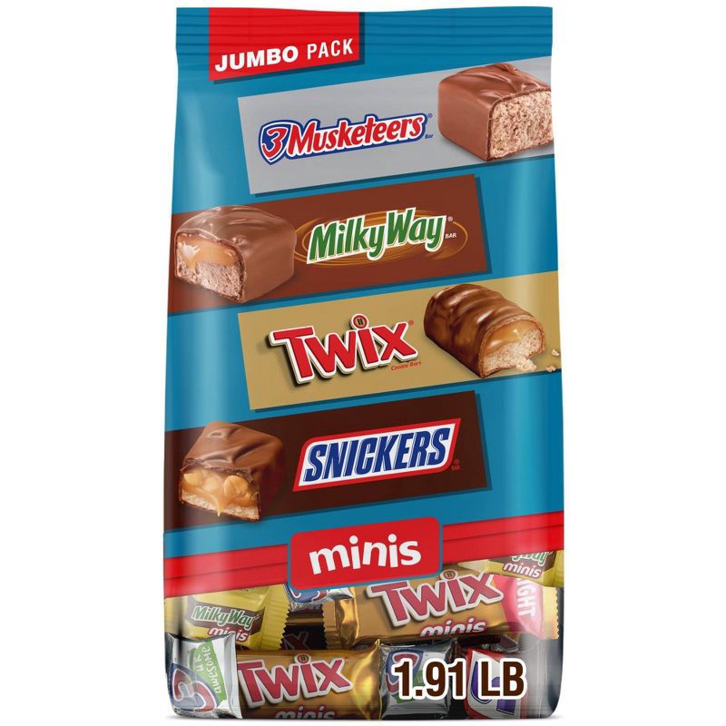- Contains one (1) 30.63 ounce, jumbo pack variety bag of SNICKERS, TWIX, MILKY WAY & 3 MUSKETEERS Minis Chocolate Candy Bars