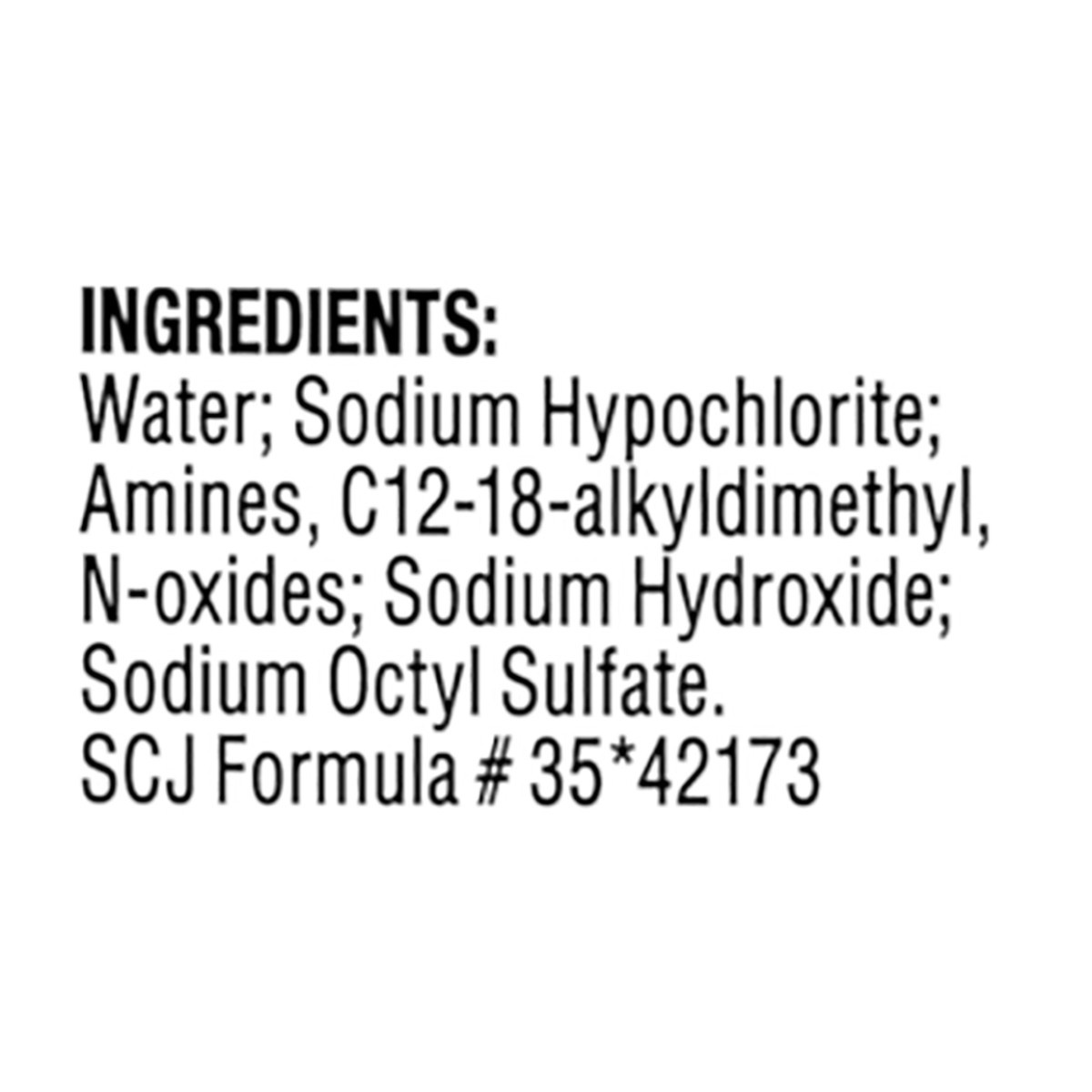 Water; Sodium Hypochlorite; Amines, C12-18-Alkyldimethyl, N-Oxides; Sodium Hydroxide; Sodium Octyl Sulfate. SCJ Formula No. 35 42173.