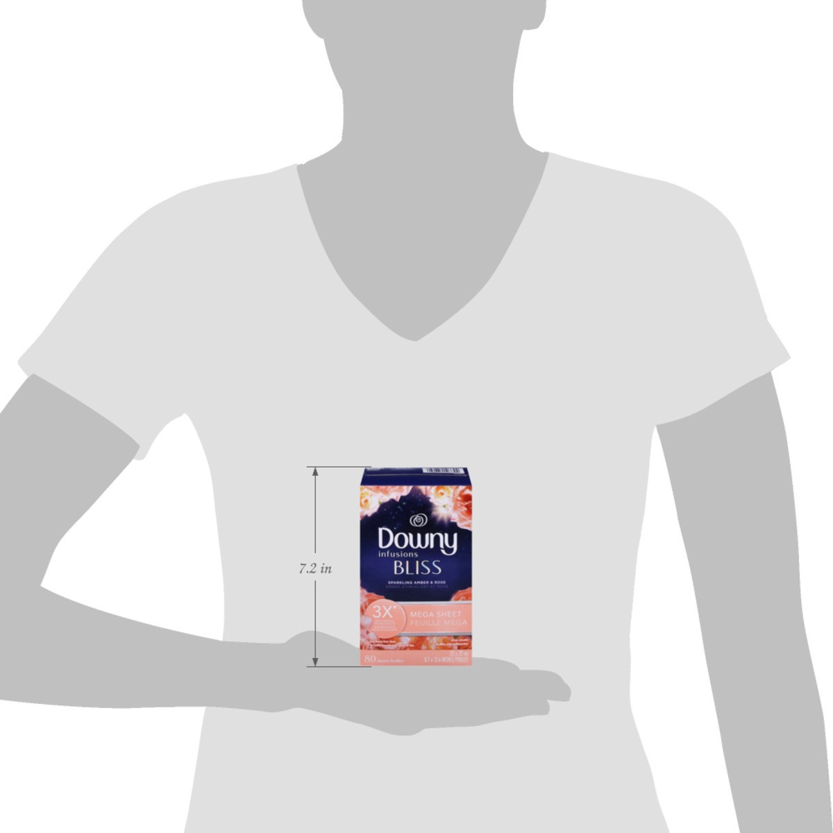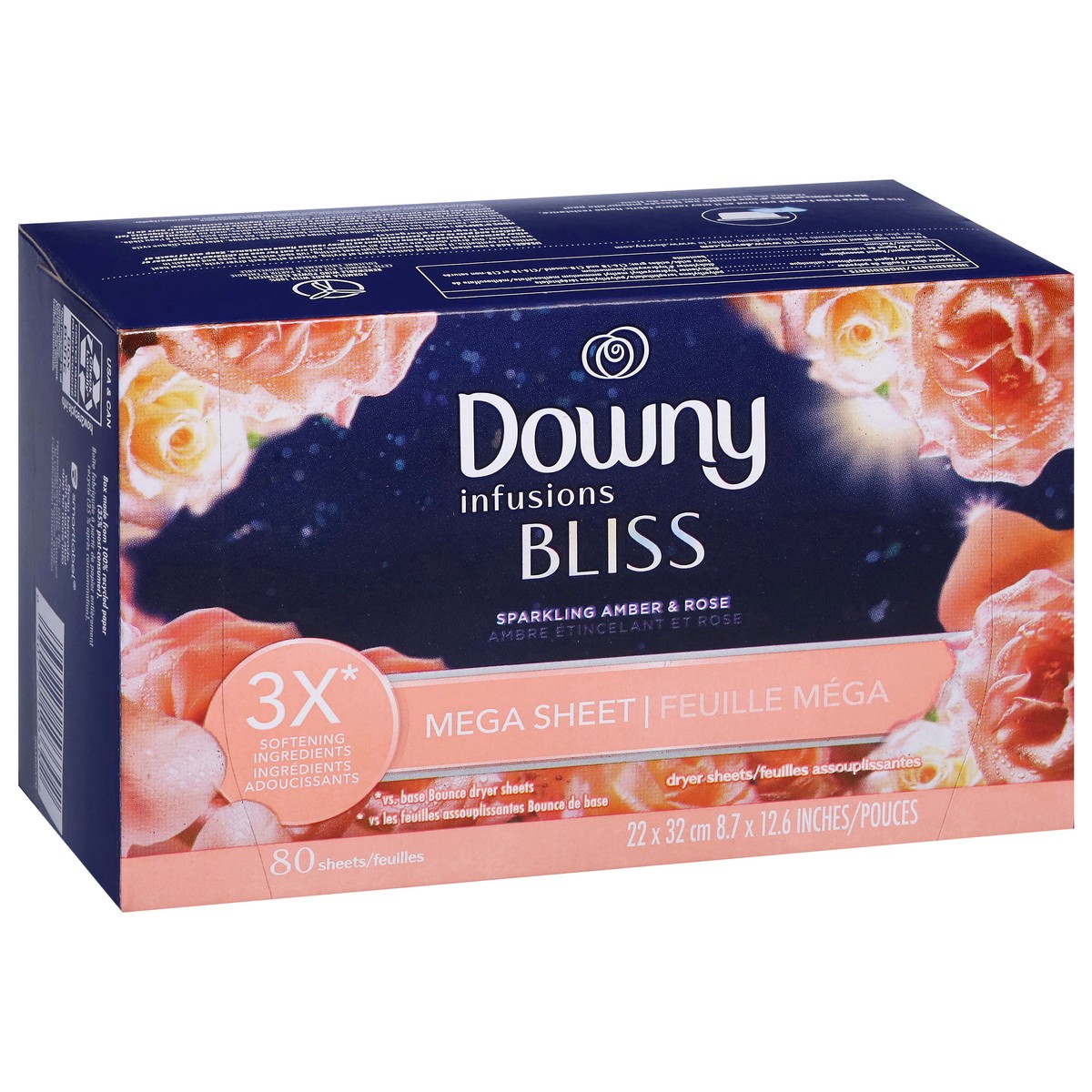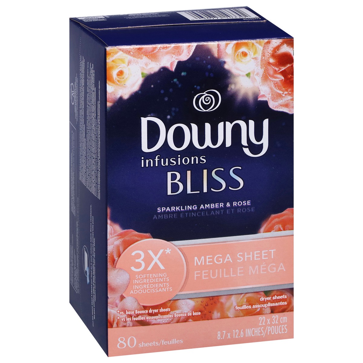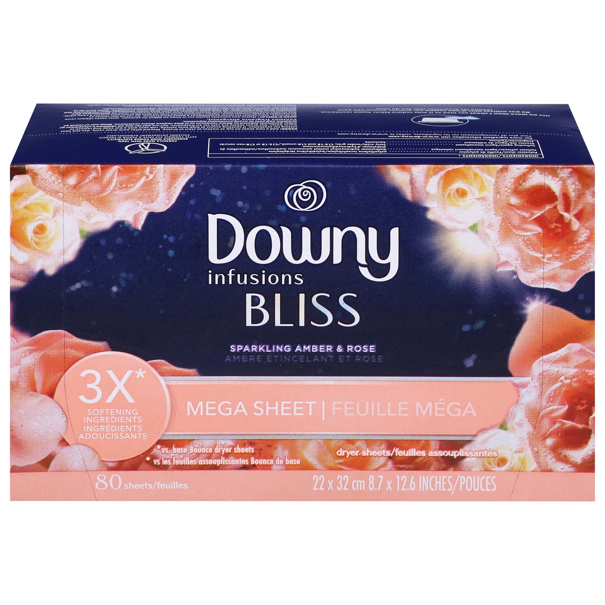 Give your laundry the radiant scents of amber and rose with Downy Infusions Bliss mega sheets. Featuring 3x more softening ingredients for a longer-lasting freshness, these dryer sheets feautre four b…