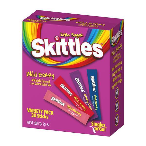 Skittles Zero Sugar singles to go powdered drink mix. Non-Carbonated low calorie drink mix.