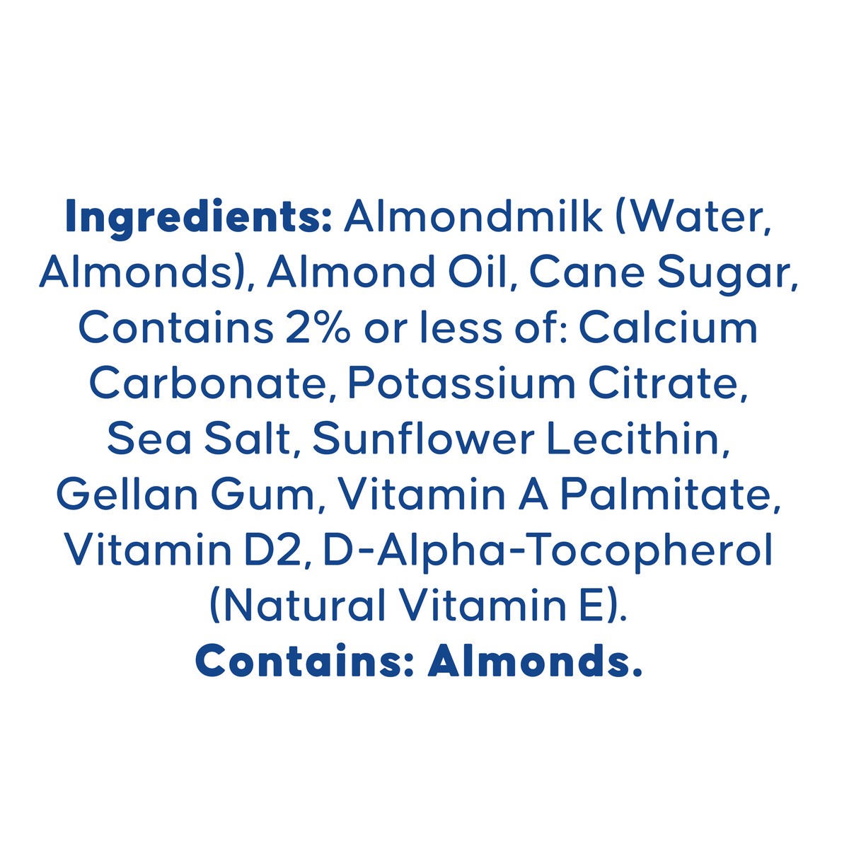 Almondmilk (Water, Almonds), Almond Oil, Cane Sugar, Contains 2% or Less of: Calcium Carbonate, Potassium Citrate, Sea Salt, Sunflower Lecithin, Gellan Gum, Vitamin A Palmitate, Vitamin D2, D-Alpha-To…