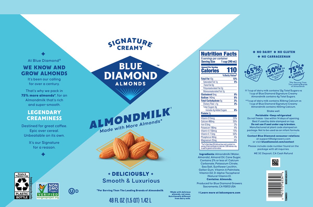 At Blue Diamond, we know and grow almonds. It's been our calling for over a century. That's why we pack 75% more almonds*, for an Almondmilk that's rich and super-smooth. Blue Diamond Signature Creamy…