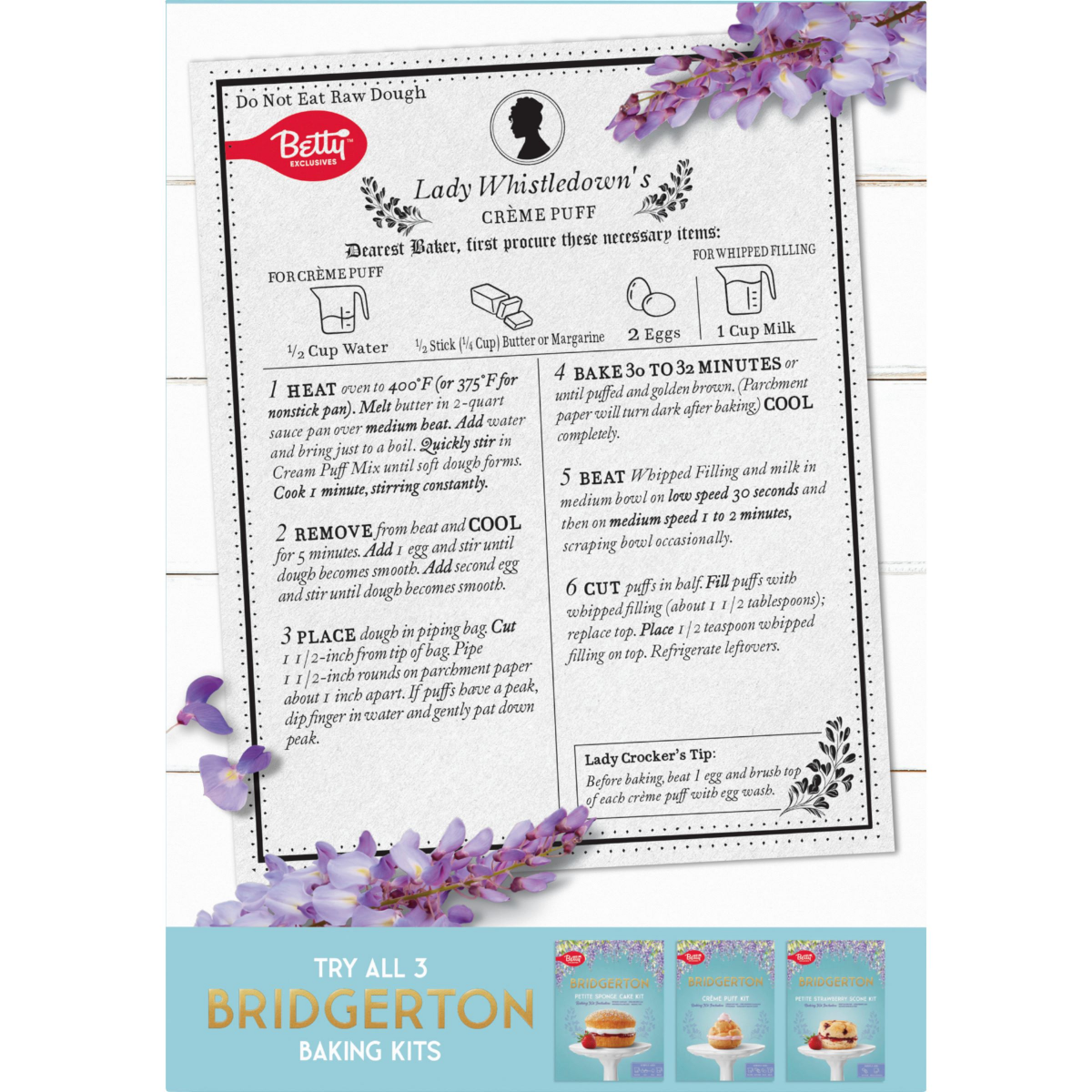 Perfect for a summer dessert, birthday celebration and more, Betty Crocker Bridgerton Crème Puff Kit is the easy baking solution to all your sweet treat needs. Ready to bake in minutes, this Bridgerto…
