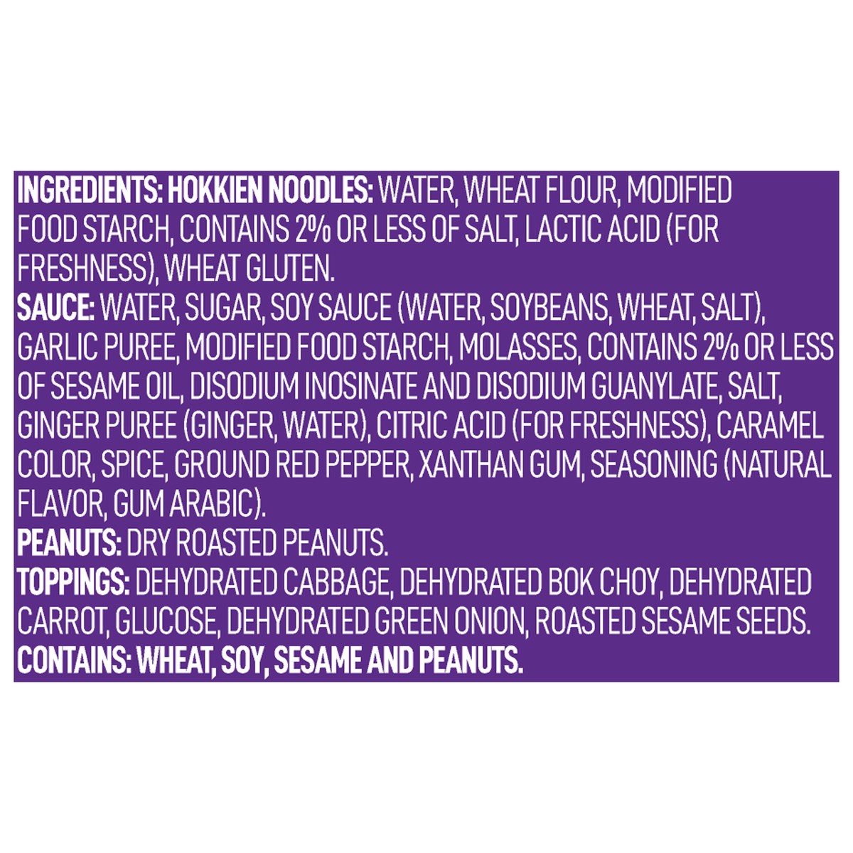 Hokkien Noodles: Water, Wheat Flour, Modified Food Starch, Contains 2% or Less of Salt, Lactic Acid (for Freshness), Wheat Gluten, Sauce: Water, Sugar, Soy Sauce (Water, Soybeans, Wheat, Salt), Garlic…