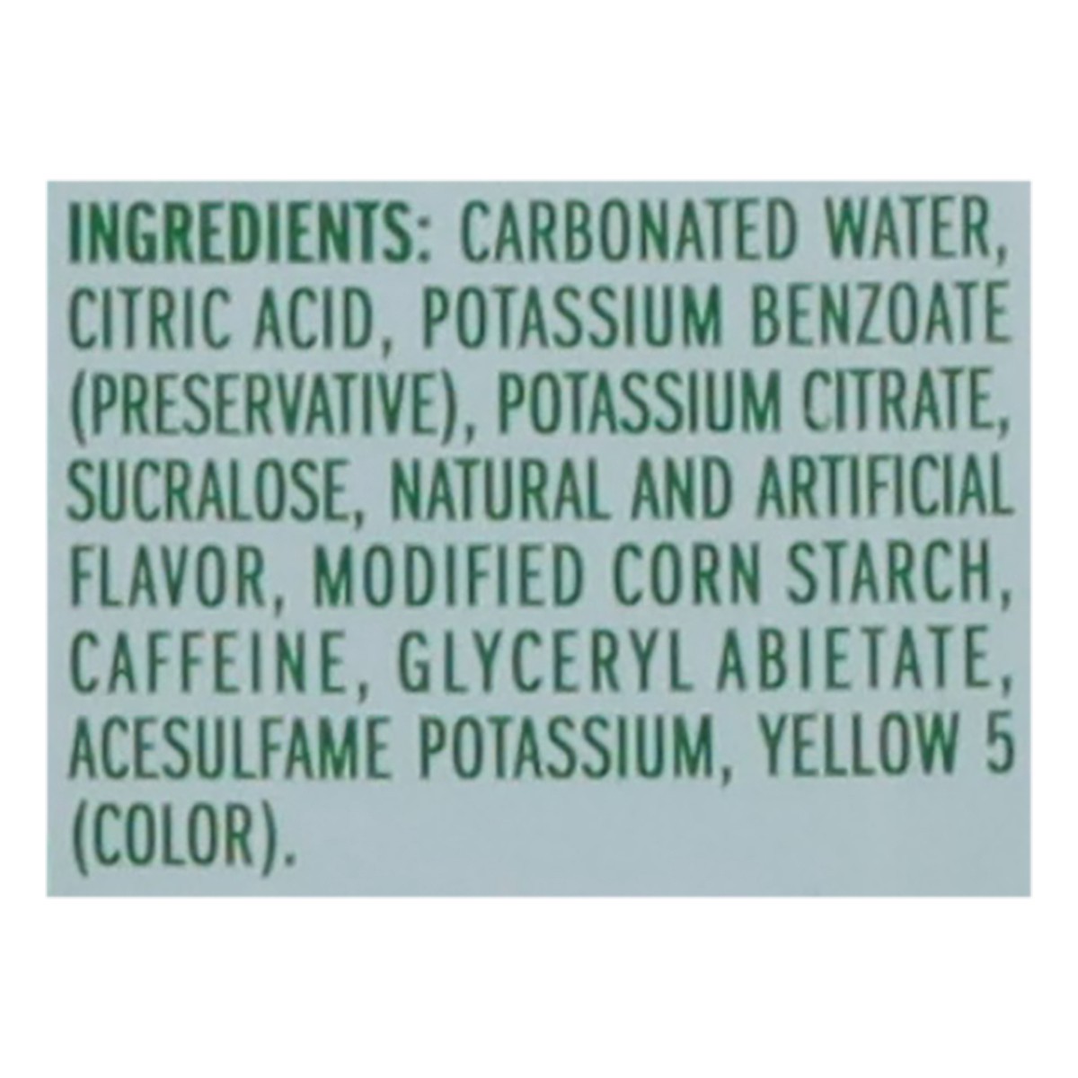 Carbonated Water, Citric Acid, Potassium Benzoate (Preservative), Potassium Citrate, Sucralose, Natural and Artificial Flavor, Modified Corn Starch, Caffeine, Glyceryl Abietate, Acesulfame Potassium, …