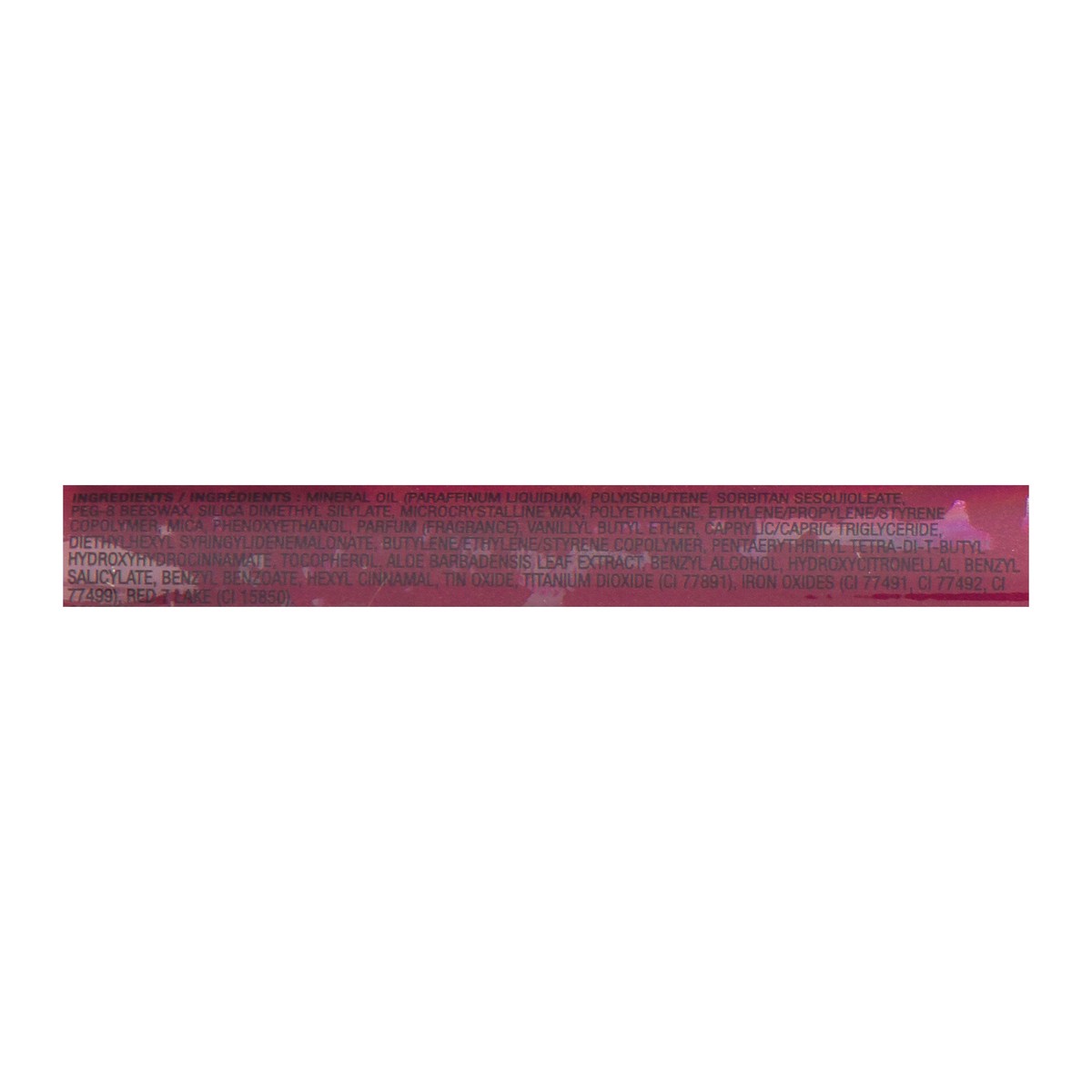 Mineral Oil (Paraffinum Liquidum), Polyisobutene, Sorbitan Sesquioleate, PEG-8 Beeswax, Silica Dimethyl Silylate, Microcrystalline Wax, Polyethylene, Ethylene/Propylene/Styrene Copolymer, Mica, Phenox…