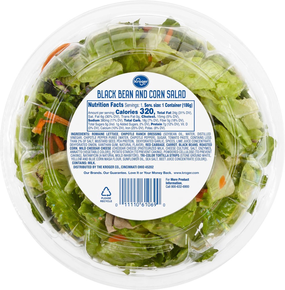 Kroger® Black Bean and Corn Salad Kit For One packs a punch with romaine lettuce, tasty black beans, and roasted corn. A sprinkle of mild cheddar cheese adds a delicious touch. Finish with a crunch of…