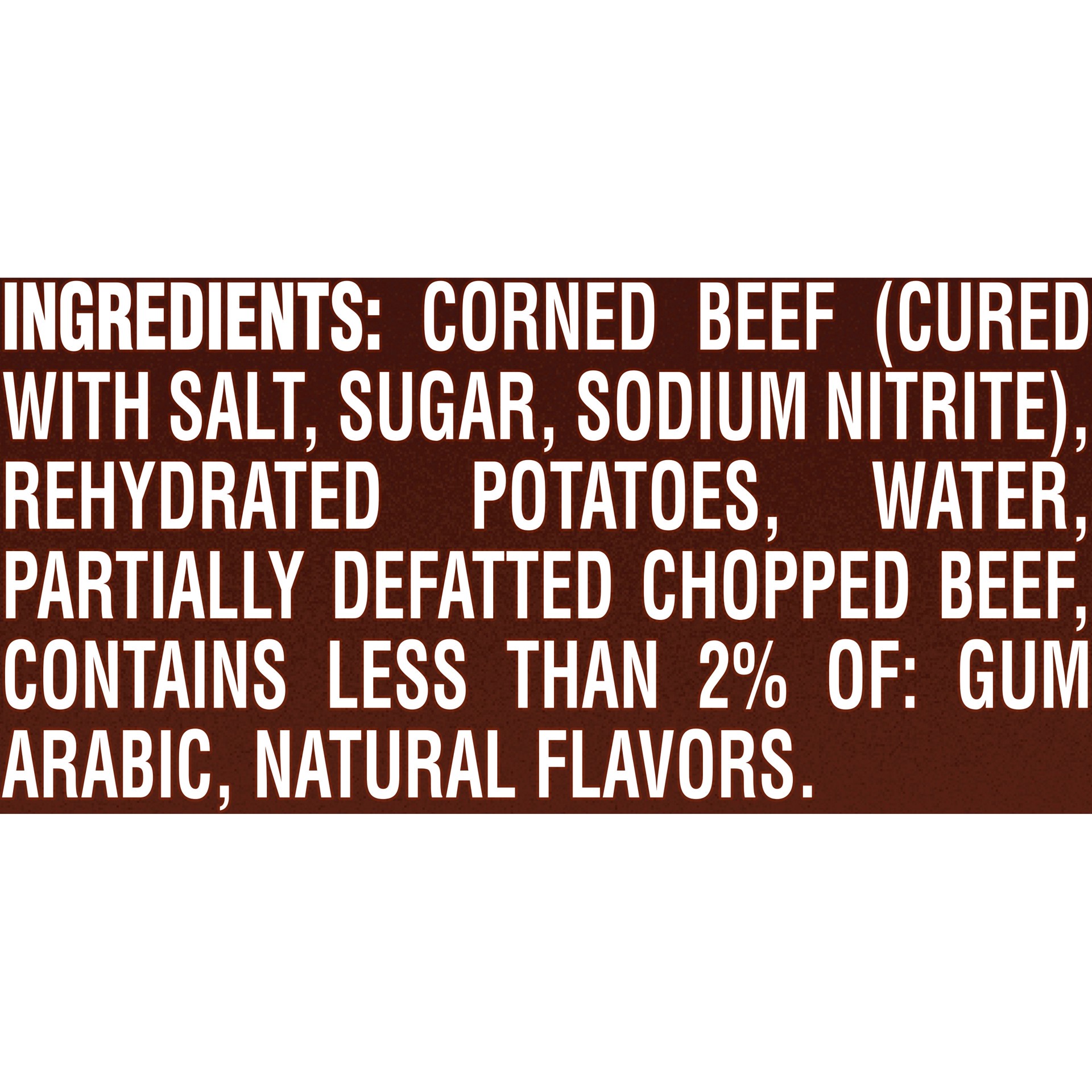 Corned Beef (Cured with Salt, Sugar, Sodium Nitrite), Rehydrated Potatoes, Water, Partially Defatted Chopped Beef, Contains less than 2% of: Gum Arabic, Natural Flavors.