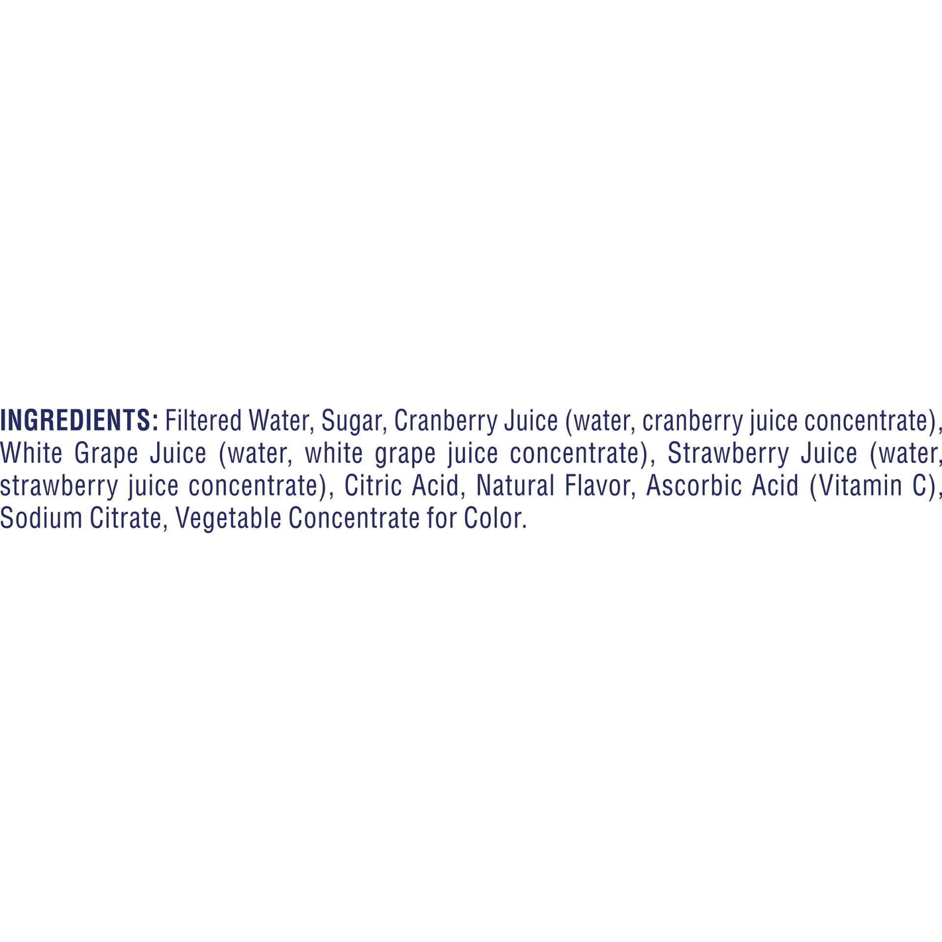 Filtered Water, Sugar, Cranberry Juice (Water, Cranberry Juice Concentrate), Grape Juice (Water, Grape Juice Concentrate), Strawberry Juice (Water, Strawberry Juice Concentrate), Citric Acid, Natural …