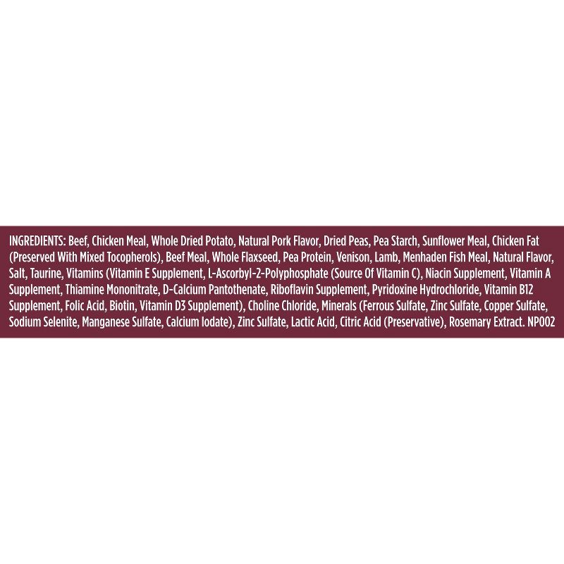 Beef, Chicken Meal, Whole Dried Potato, Natural Pork Flavor, Dried Peas, Pea Starch, Sunflower Meal, Chicken Fat (Preserved With Mixed Tocopherols), Beef Meal, Whole Flaxseed, Pea Protein, Venison, La…