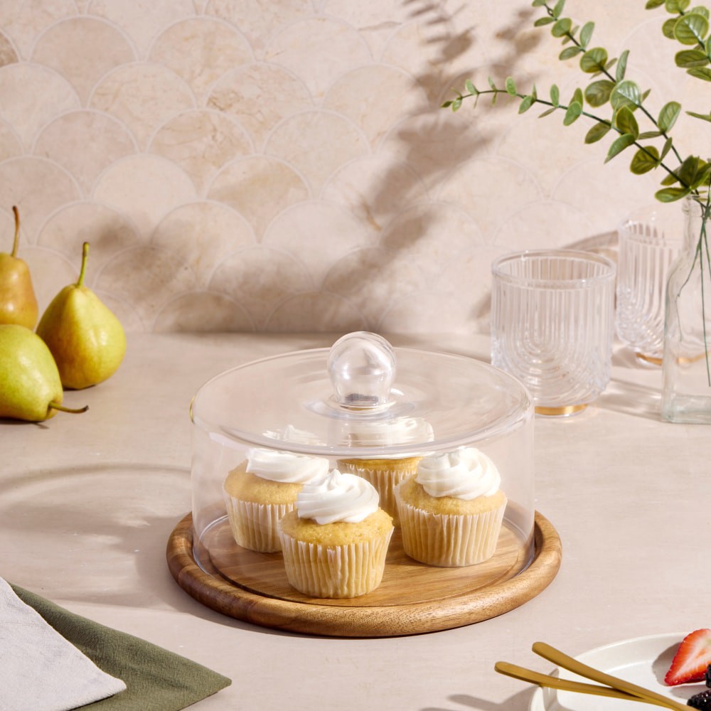Suitable for everyday use and entertaining Acacia Wood and Glass Plate Wipe clean with damp cloth Glass cloche dishwasher safe