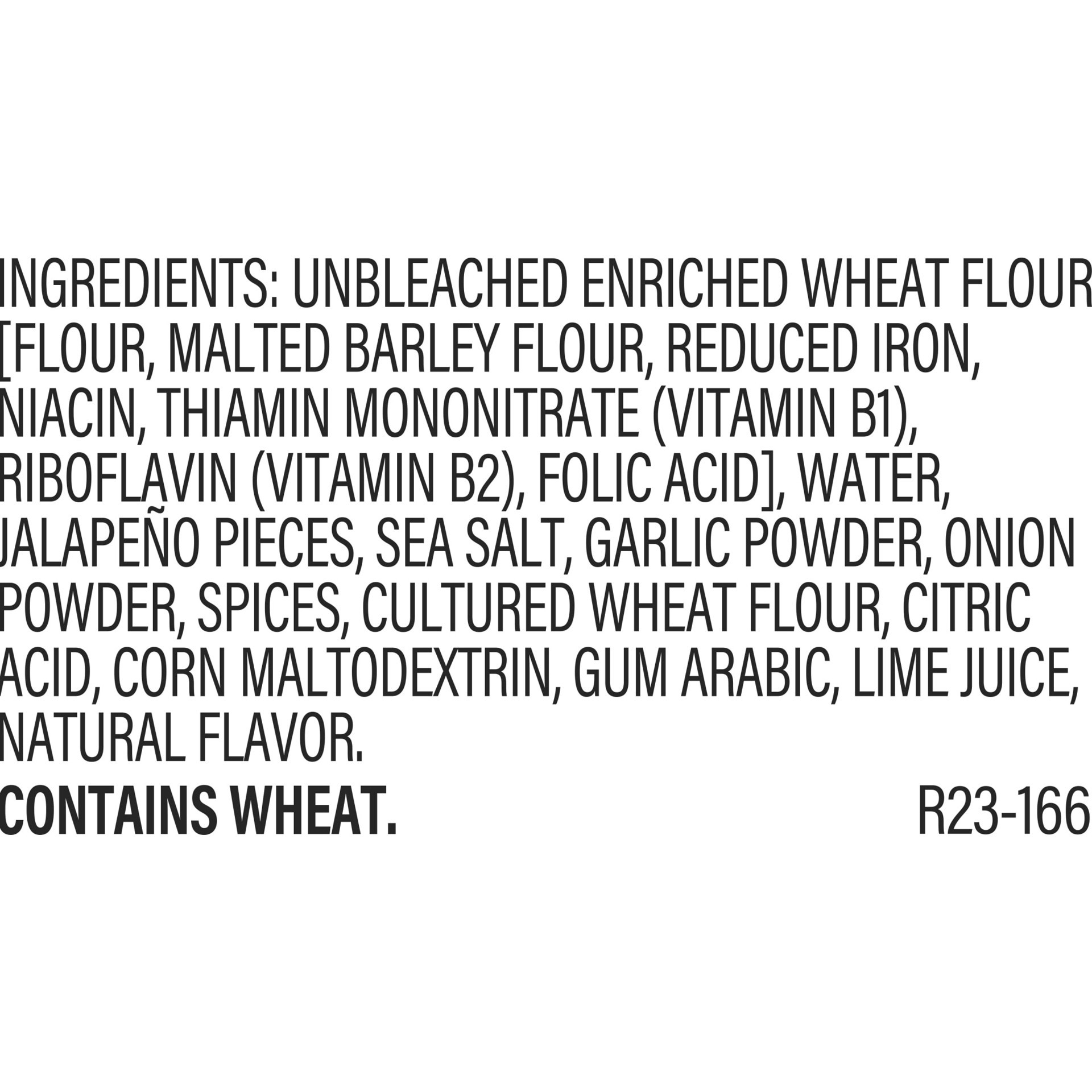 Unbleached Enriched Wheat Flour [Flour, Malted Barley Flour, Reduced Iron, Niacin, Thiamin Mononitrate, Riboflavin, Folic Acid], Water, Jalapeño Pieces, Sea Salt, Garlic Powder, Onion Powder, Spices, …