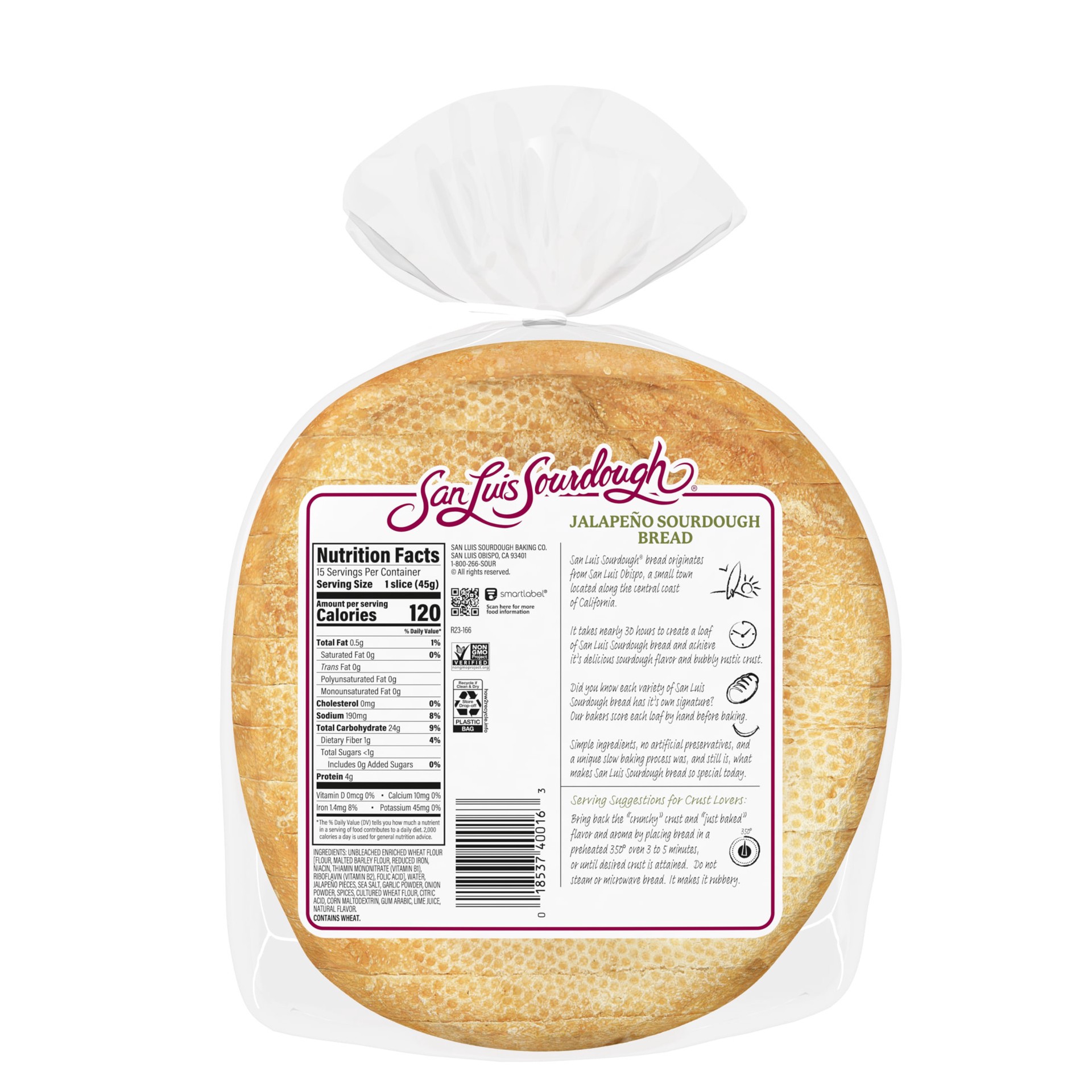 Baked with simple ingredients, no preservatives, and non-GMO Project Verified, San Luis Jalapeño Sourdough Bread delivers great tasting, authentic California sourdough with heat!