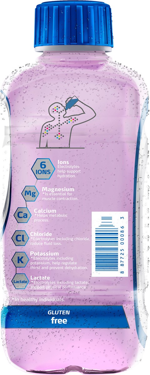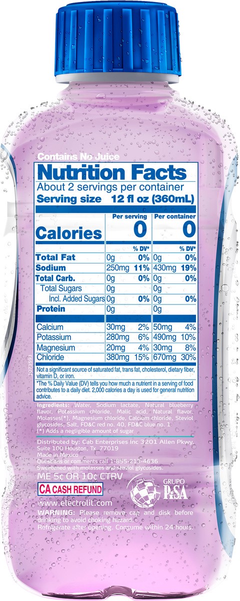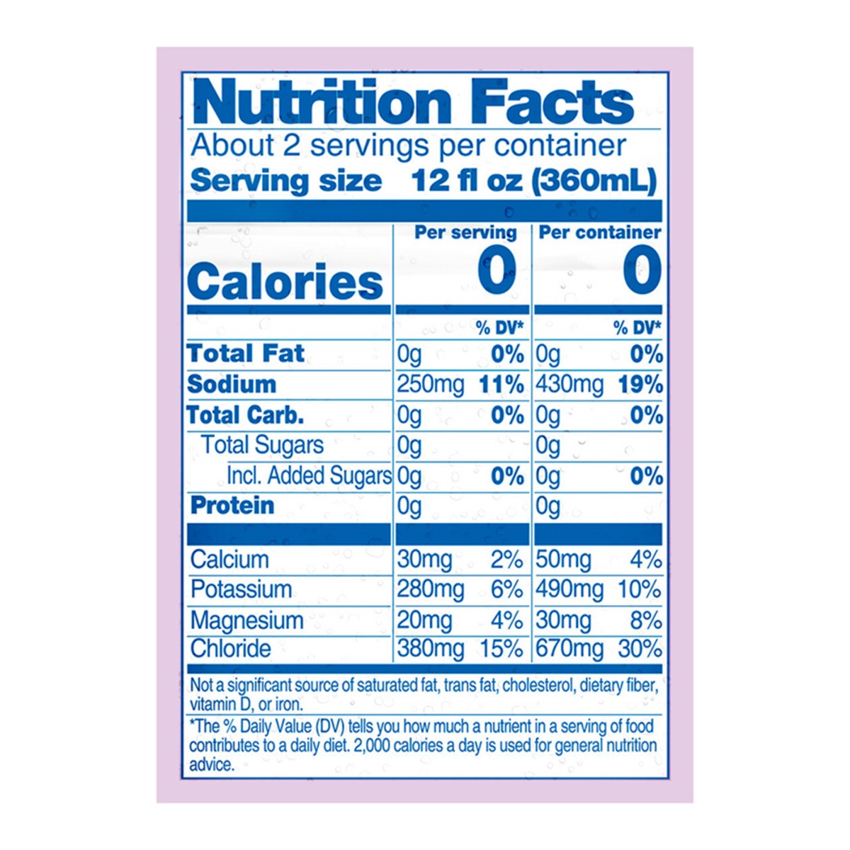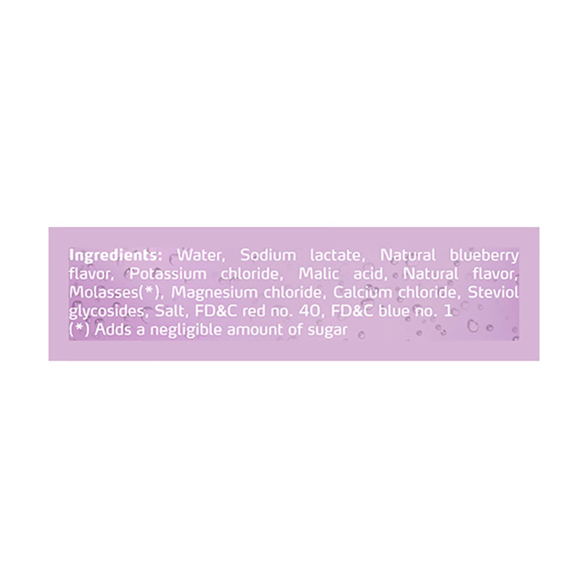 Water. Contains 2% or less of: Sodium lactate, Natural Blueberry flavor, Potassium chloride, Malic acid, Natural Flavor, Molasses (*), Magnesium chloride, Calcium chloride, Steviol glycosides…