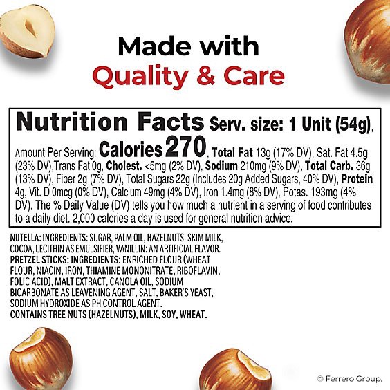 Ingredients: Nutella: Sugar, Palm Oil, Hazelnuts, Skim Milk, Cocoa, Soy Lecithin as Emulsifier Vanillin: an Artificial Flavor. Pretzel Sticks: Enriched Flour (Wheat Flour, Niacin, Iron , Thiamine Mono…
