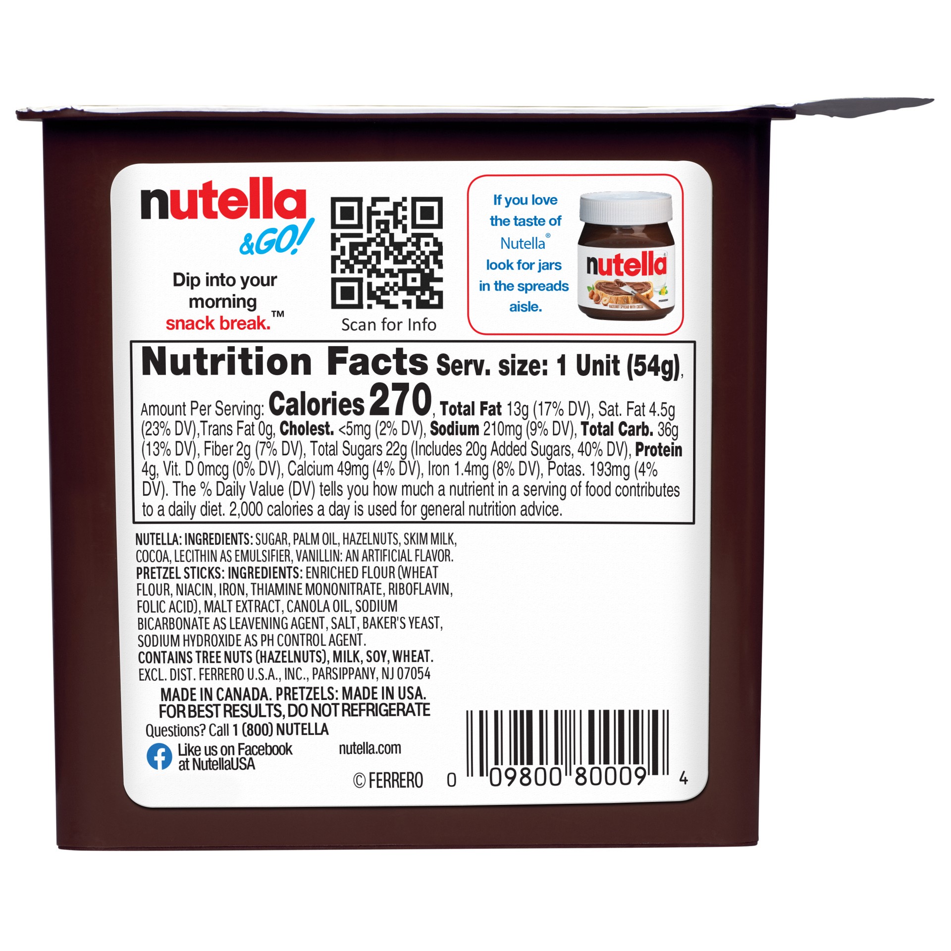 with pretzel sticks Per Unit 270 calories. Ferrero & go! if you love the taste of nutella look for jars in the spread aisle. Dip into your morning snack break. nutella.com. Facebook: Like us on facebo…
