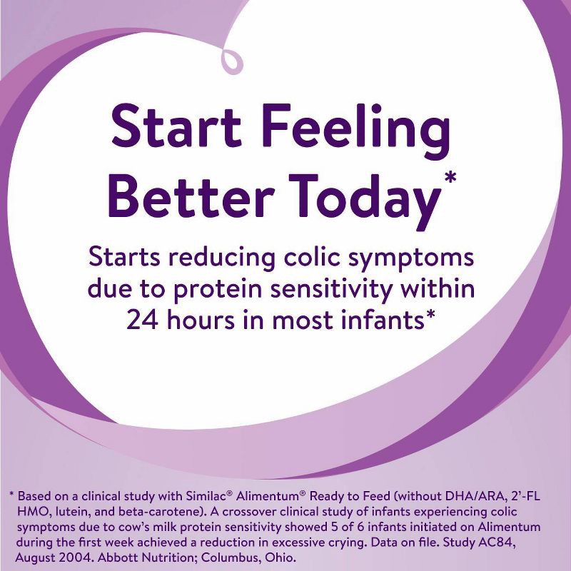 - START FEELING BETTER TODAY*: Similac Alimentum starts reducing colic symptoms due to protein sensitivity within 24 hours in most infants*