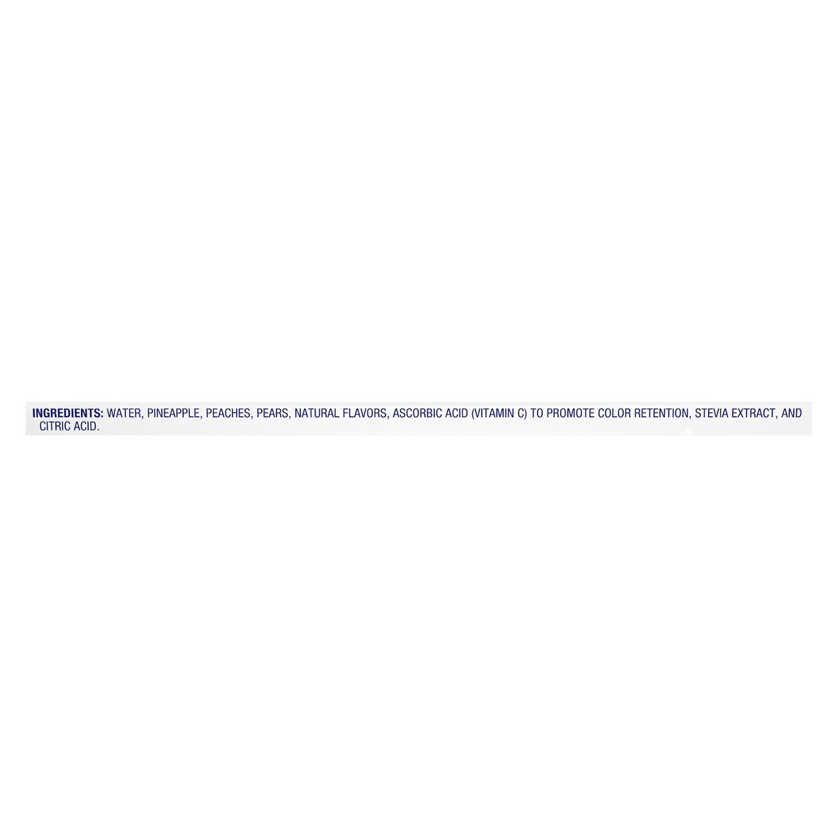 Water, Pineapple, Peaches, Pears, Natural Flavors, Ascorbic Acid (Vitamin C) to Promote Color Retention, Stevia Extract, and Citric Acid.