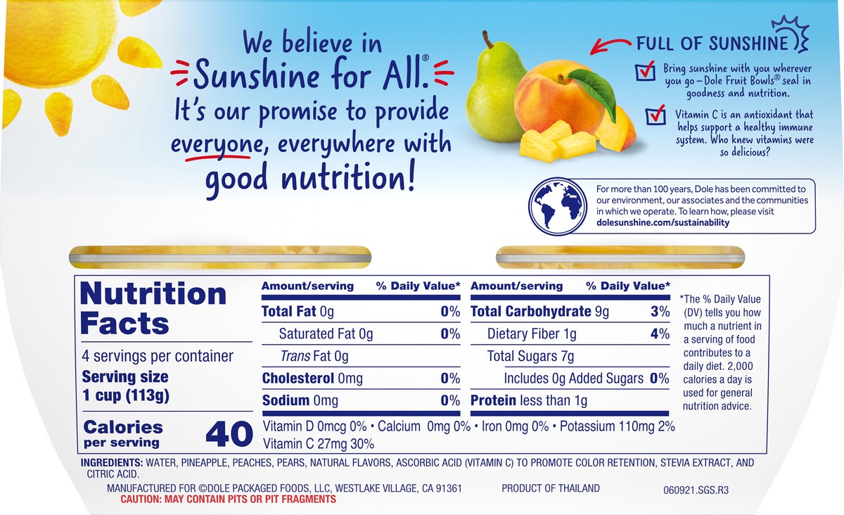 Sunshine for all. No artificial sweeteners. For more than 100 years. Dole has been committed to our environment, our associates and the communities in which we operate. To learn how, please visit doleā¦