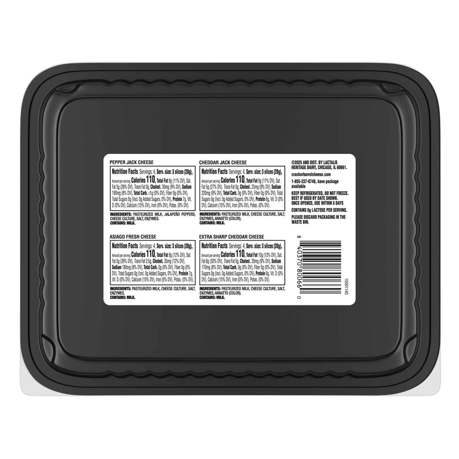 Pepper jack cheese: contains: milk.,cheddar jack cheese: contains: milk.,asiago fresh cheese: contains: milk.,extra sharp cheddar cheese: contains: milk.