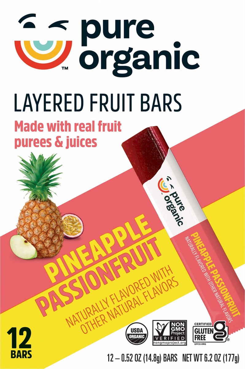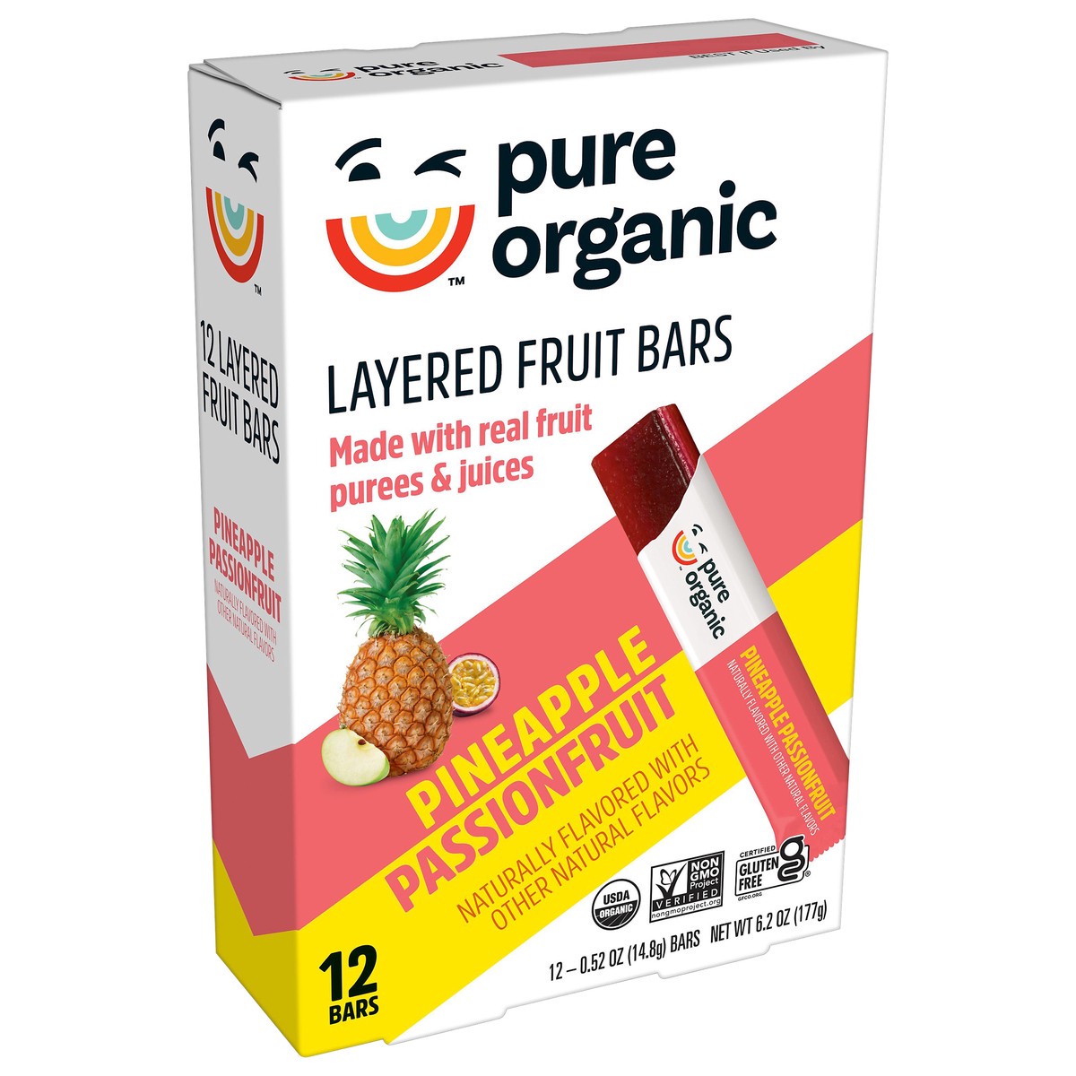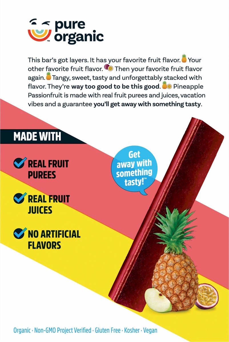 A Pure take on fruit snacks. Pure Organic Pineapple Passionfruit Layered Fruit Bars are triple-layered, dual-flavored sweet and tart treats. Each snack bar is certified organic, non-GMO Project Verifi…