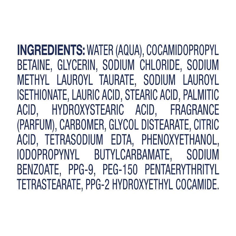 Water (Aqua), Cocamidopropyl Betaine, Glycerin, Sodium Chloride, Sodium Methyl Lauroyl Taurate, Sodium Lauroyl Isethionate, Lauric Acid, Stearic Acid, Palmitic Acid, Hydroxystearic Acid, Fragrance, Ca…