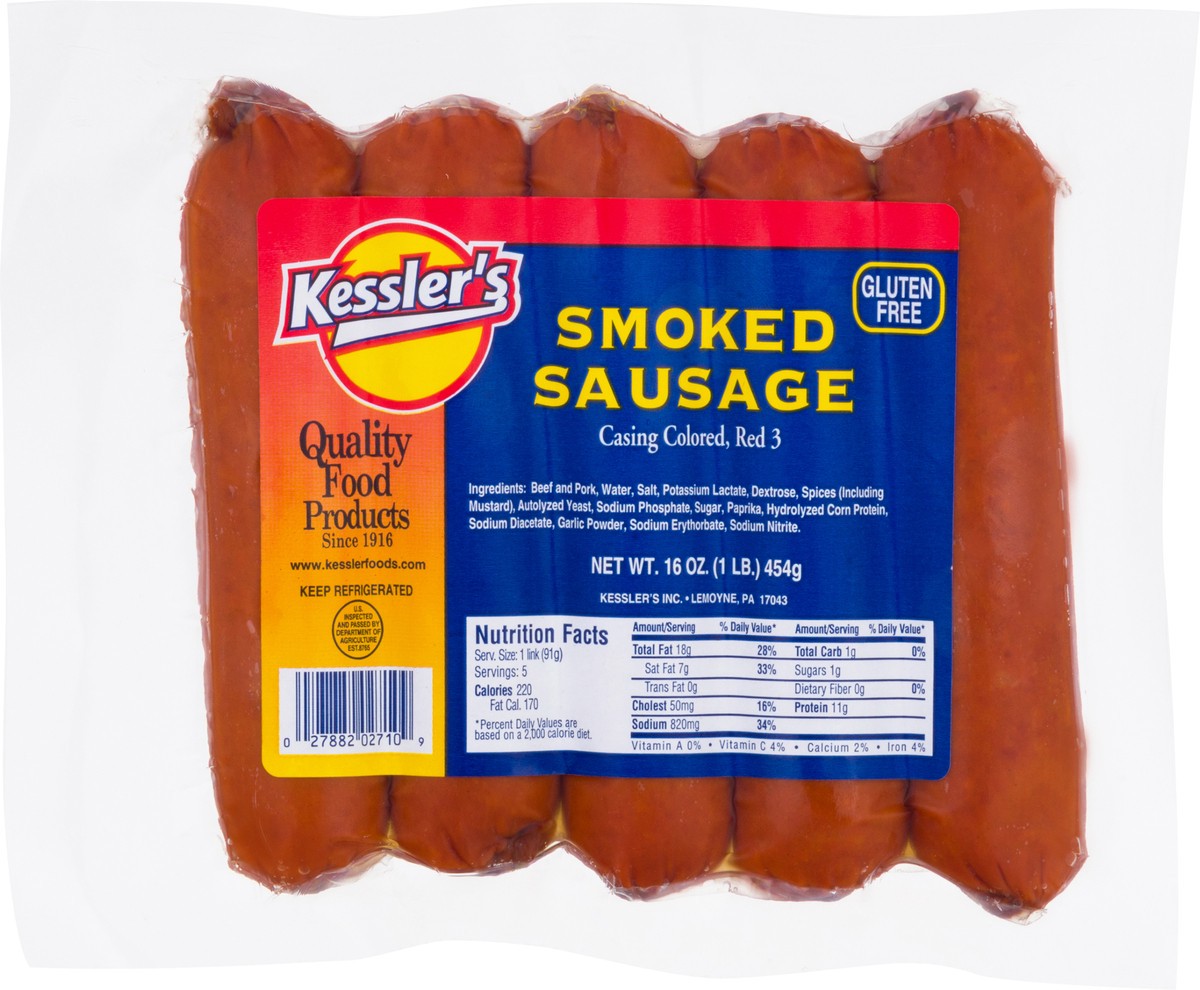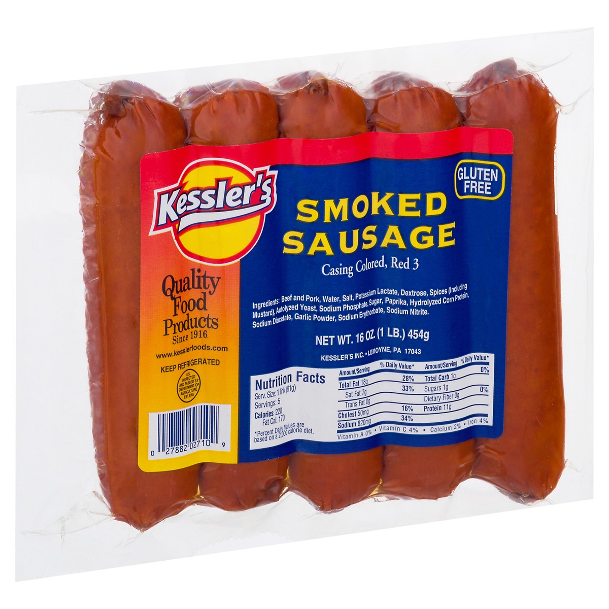 Casing colored, red 3. Gluten free. Quality food products since 1916. U.S. inspected and passed by Department of Agriculture. EST.8765. www.kesslerfoods.com.