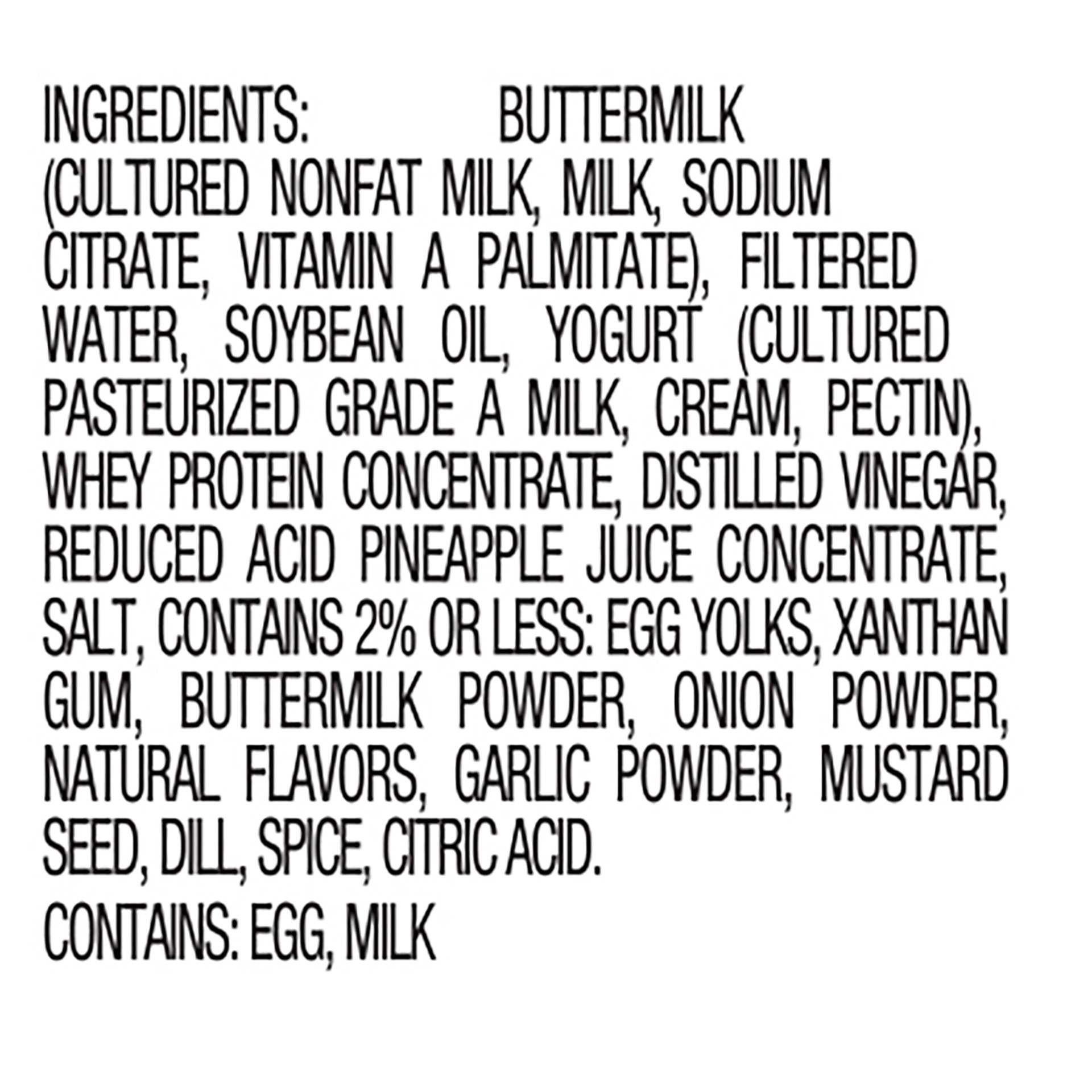Buttermilk (Cultured Nonfat Milk, Milk, Sodium Citrate, Vitamin A Palmitate), Filtered Water, Soybean Oil, Yogurt (Cultured Pasteurized Grade A Milk, Cream, Pectin), Whey Protein Concentrate, Distille…