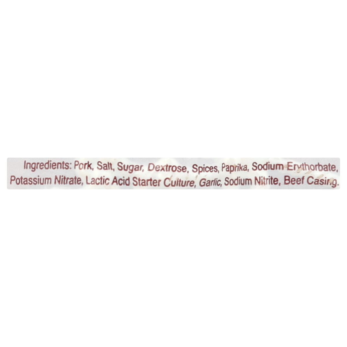 Pork, Salt, Sugar, Dextrose, Spices, Paprika, Sodium Erythorbate, Potassium Nitrate, Lactic Acid Starter Culture, Garlic, Sodium Nitrite, Beef Casing.