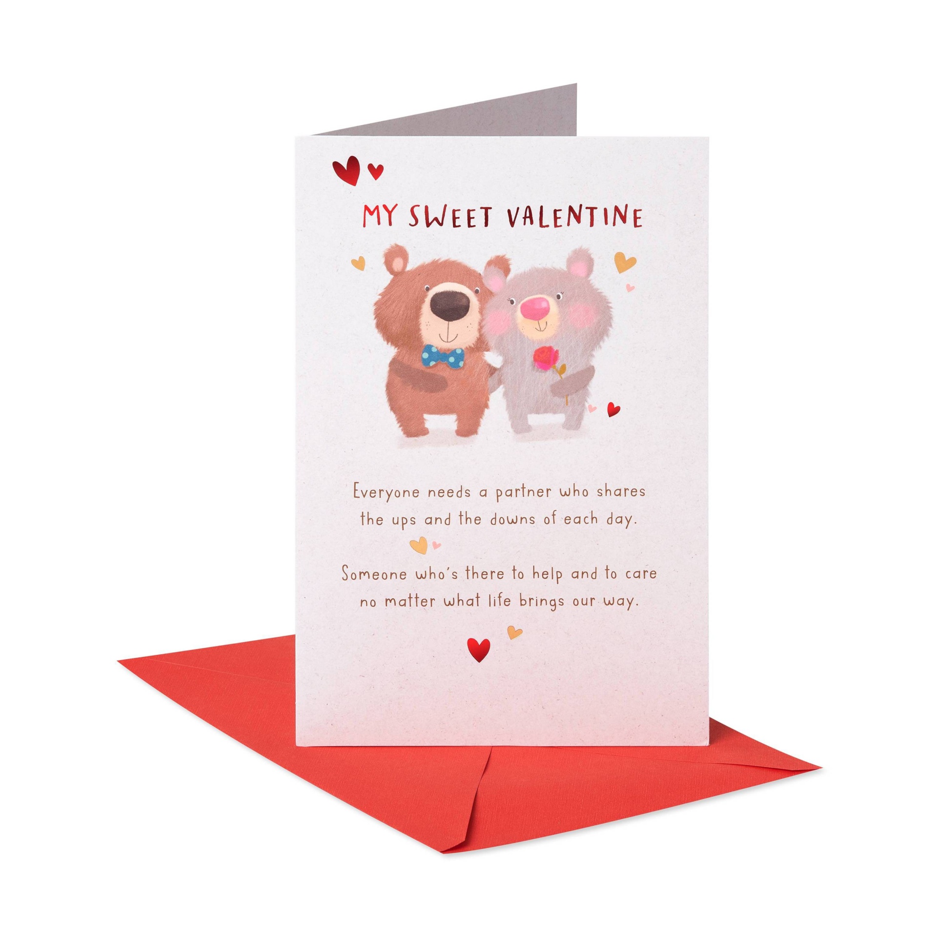 Tell your special someone you love them with a romantic Valentine’s Day card from American Greetings. This adorable card features a cute teddy bear couple with red and gold shimmering accents. The ins…
