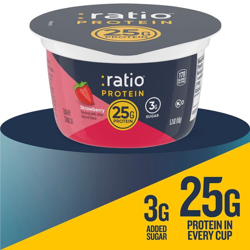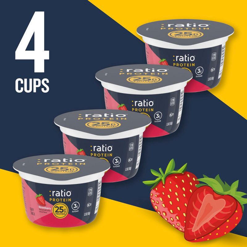 - CONTAINS: One 1 lb 5.2 oz multi-pack of :ratio Protein Strawberry Flavored Yogurt Cultured Dairy Snack; 4 single-serve cups