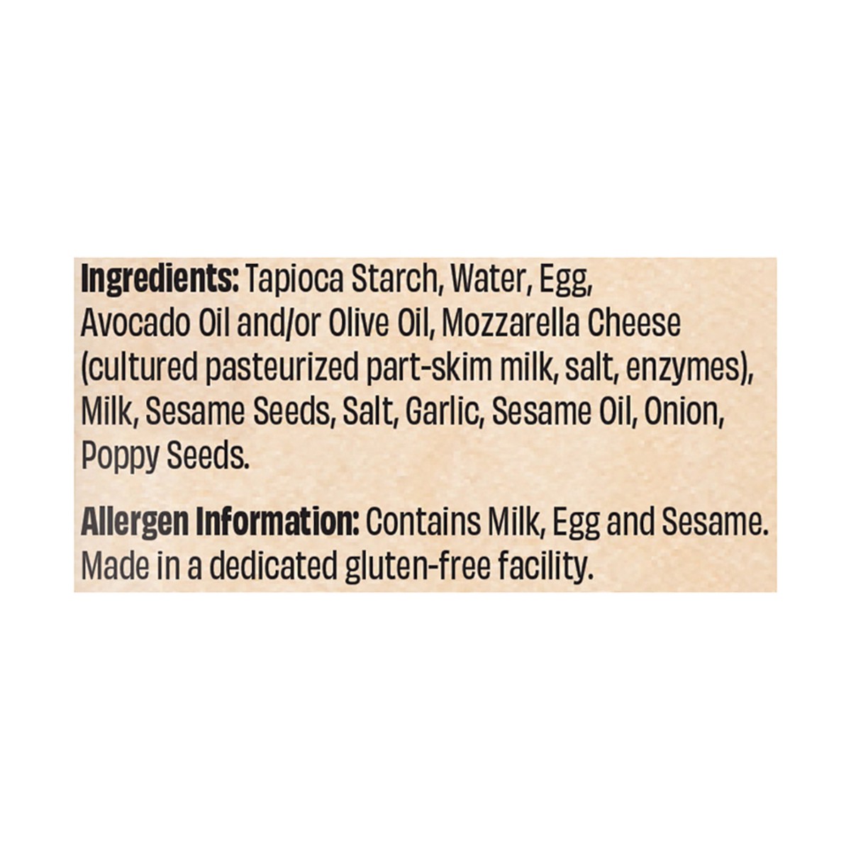 Tapioca Starch, Water, Egg, Avocado Oil and/or Olive Oil, Mozzarella Cheese (Cultured Pasteurized Part-Skim Milk, Salt, Enzymes), Milk, Sesame Seeds, Salt, Garlic, Sesame Oil, Onion, Poppy Seeds.