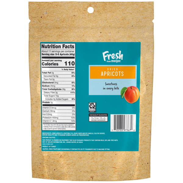 Naturally sweet, munch on the Fresh from Meijer Dried Apricots for a guilt free snack. These dried apricots do not contain any added sugars or artifical flavors. Plus, its a good source of dietary fib…