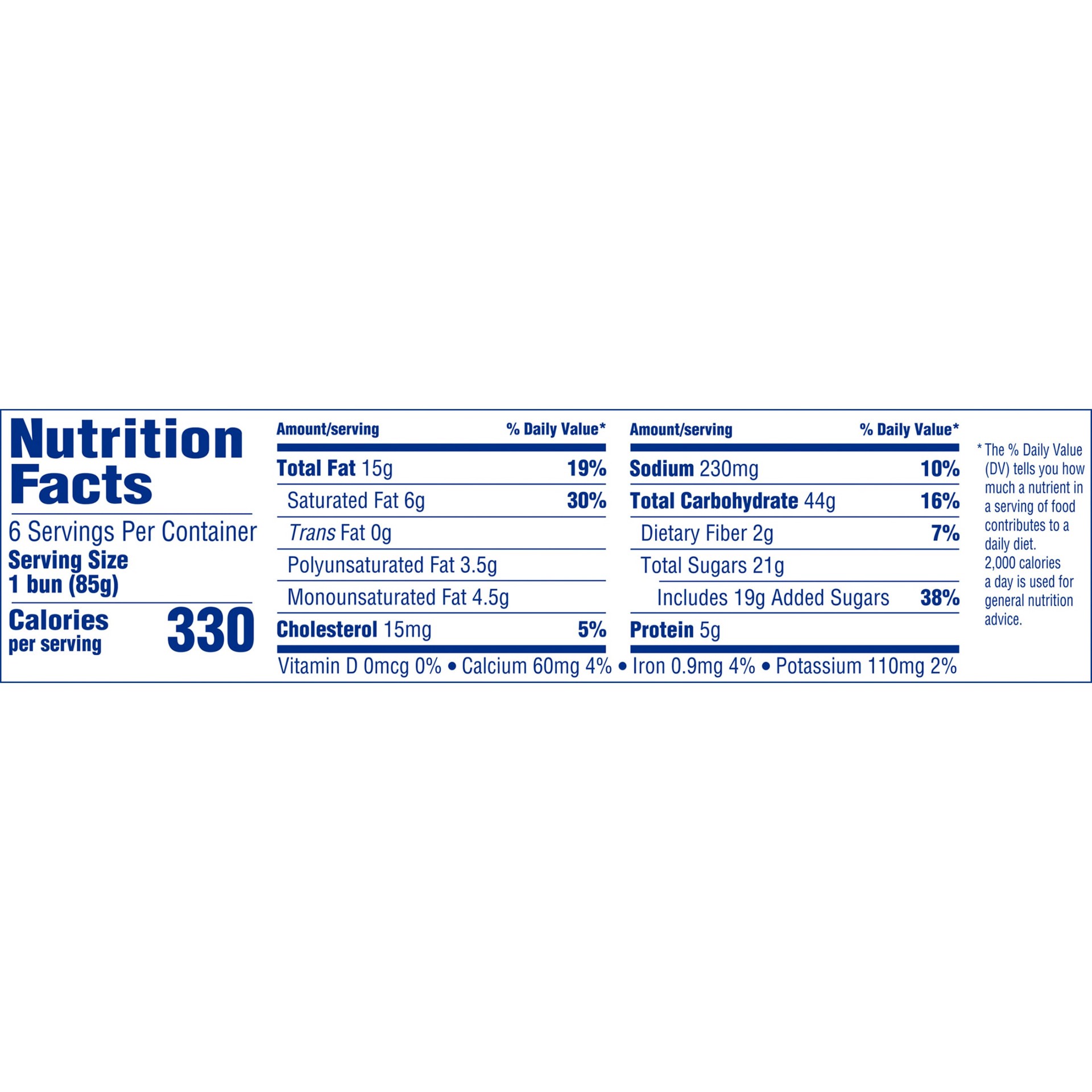 Wheat Flour, Water, Sugar, Vegetable Oil (Soybean And/Or Palm ), Dextrose, Eggs, Vegetable Shortening (Palm Oil), Yeast, Whey, Invert Sugar, Wheat Starch, Soy Flour, Mono- And Diglycerides, Cinnamon, …