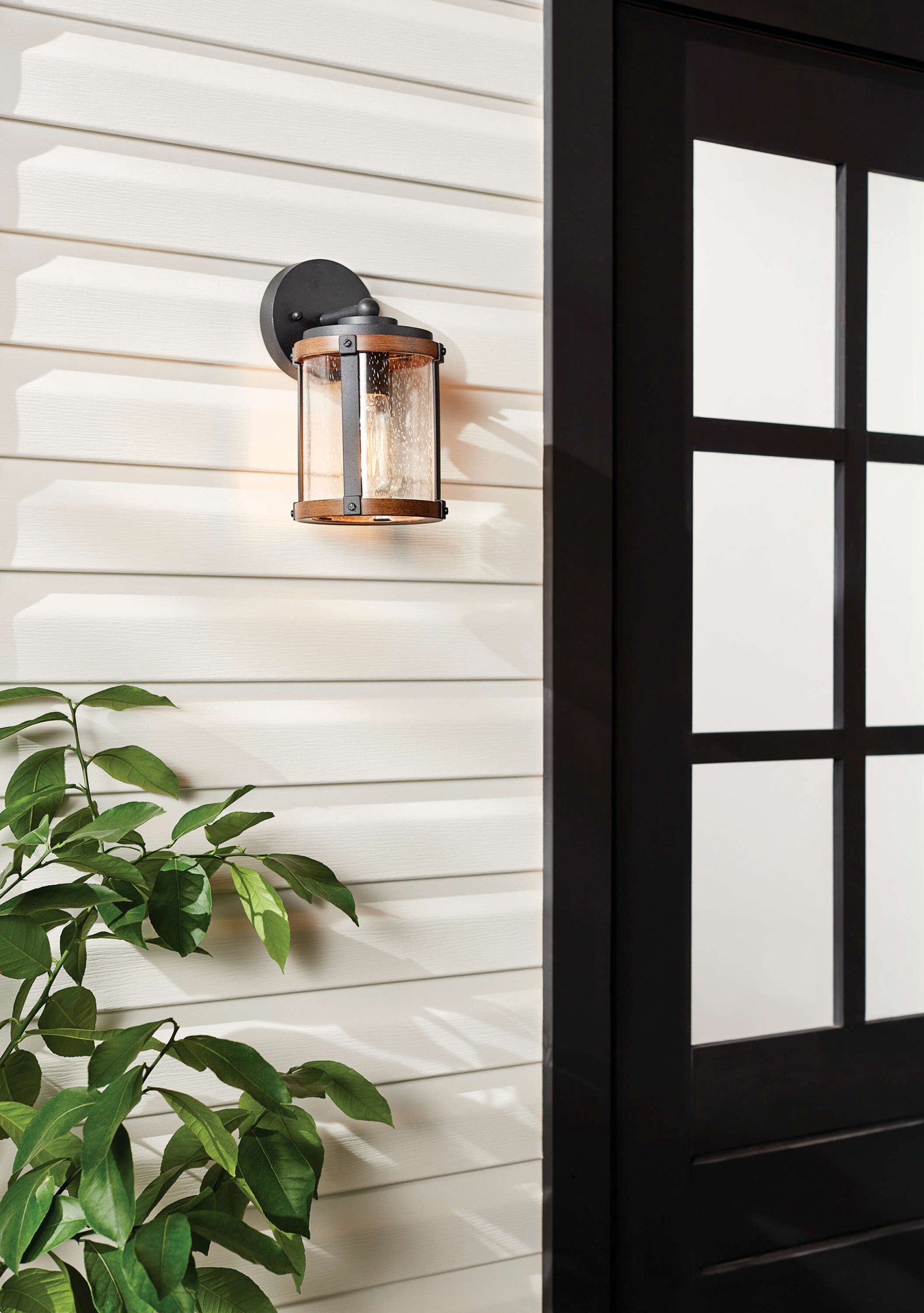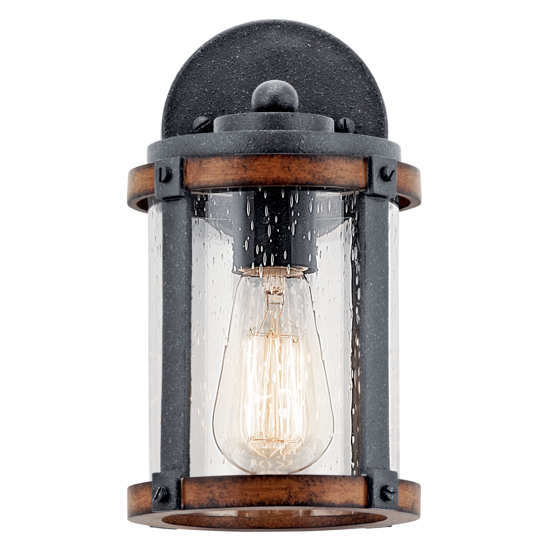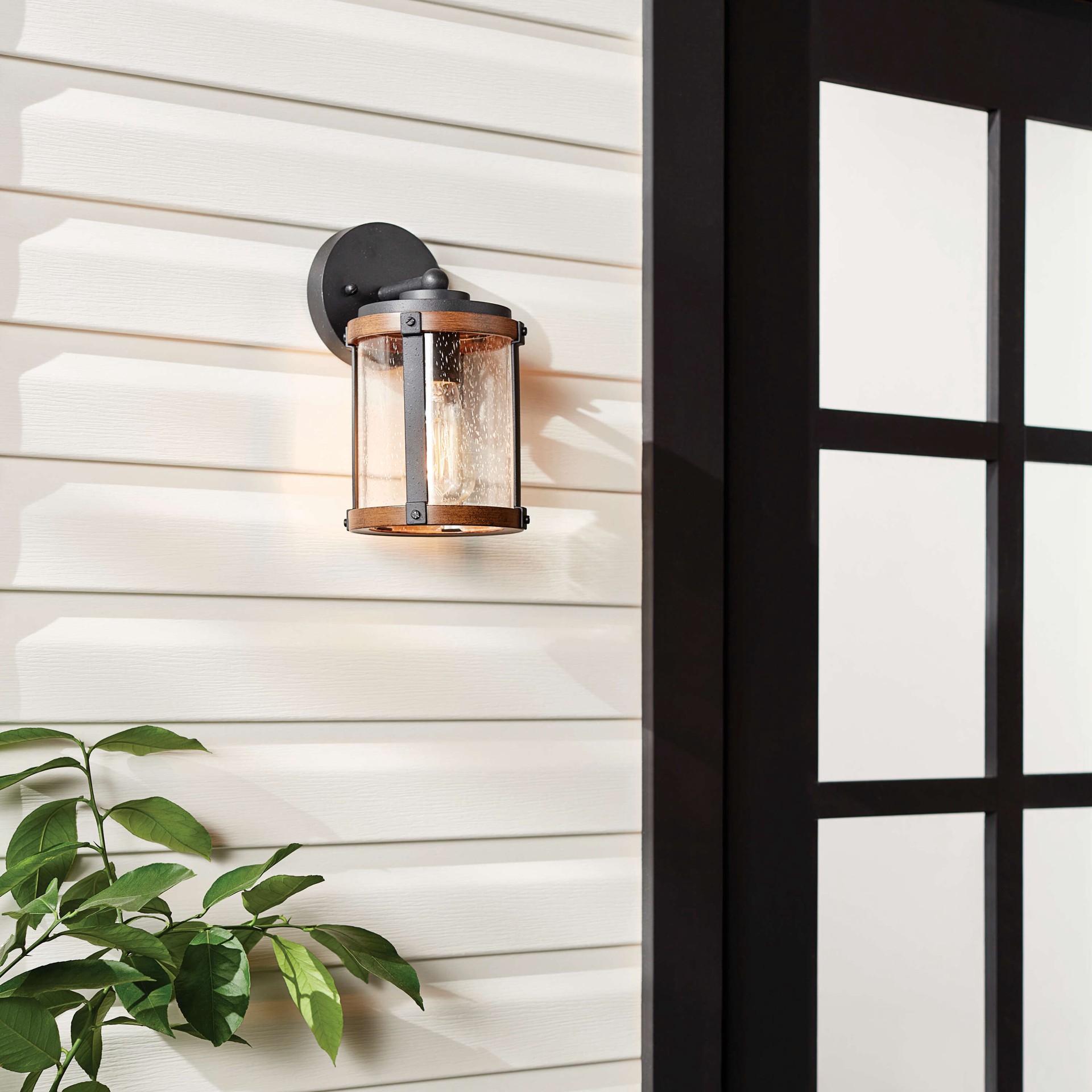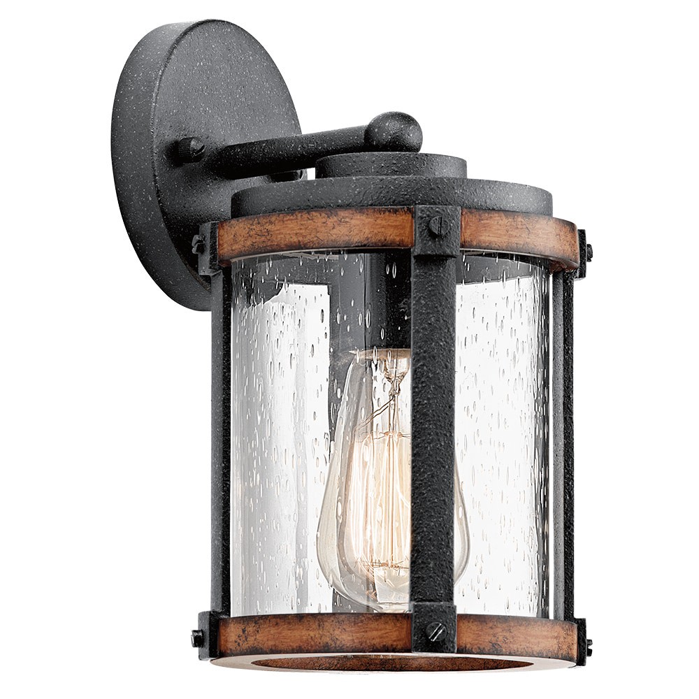 Distressed black and wood tone finish outdoor wall light is from the Barrington collection. Includes a classic seeded glass shade. Requires one 60 watt medium base bulb (not included). Fixture dimensiā¦