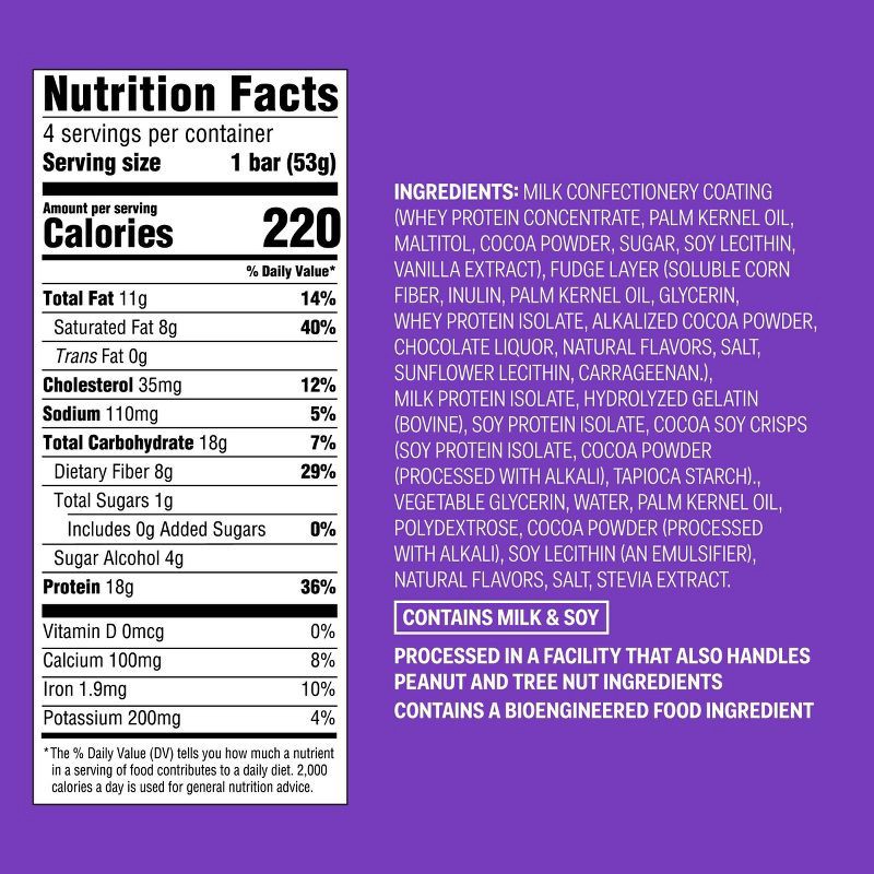 MILK CONFECTIONERY COATING (WHEY PROTEIN CONCENTRATE, PALM KERNEL OIL, MALTITOL, COCOA POWDER, SUGAR, SOY LECITHIN, VANILLA EXTRACT), FUDGE LAYER (SOLUBLE CORN FIBER, INULIN, PALM KERNEL OIL, GLYCERIN…