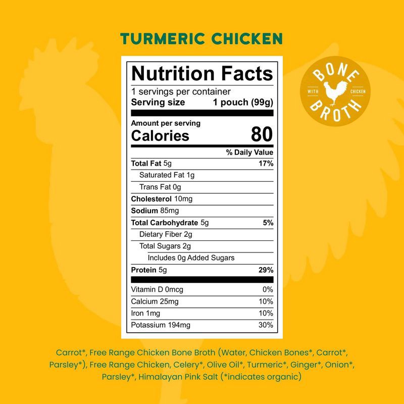 Carrot*, Free Range Chicken Bone Broth (Water, Chicken Bones*, Carrot*, Parsley*), Free Range Chicken, Celery*, Olive Oil*, Turmeric*, Ginger*, Onion*, Parsley*, Himalayan Pink Salt (*indicates organi…