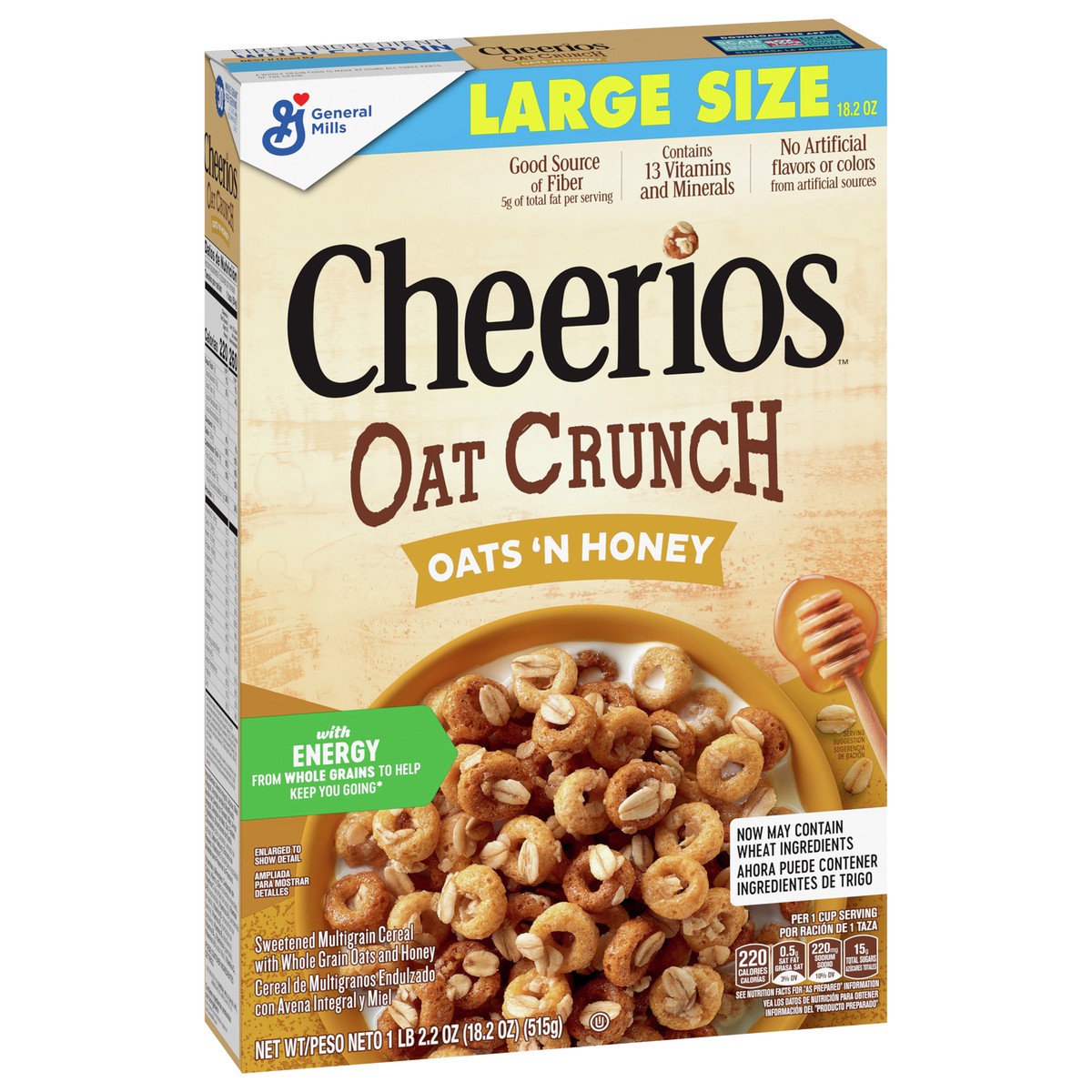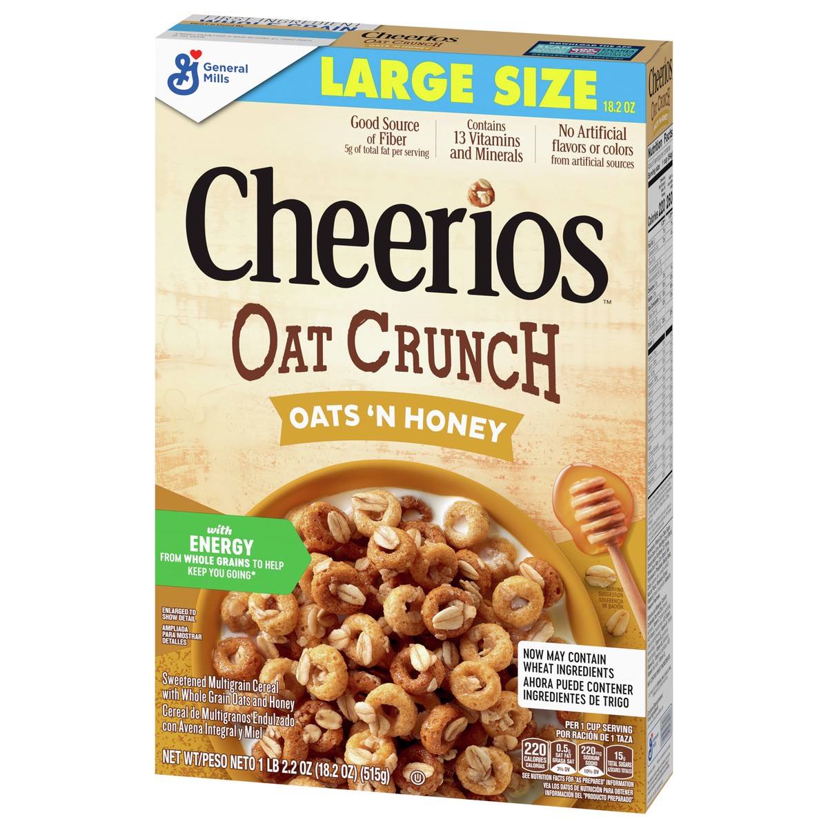 Oats on Os! Start your day with the irresistible crunch of Cheerios Oat Crunch Oats and Honey breakfast cereal. This sweetened multigrain cereal is made with whole grain oats and topped with real hone…