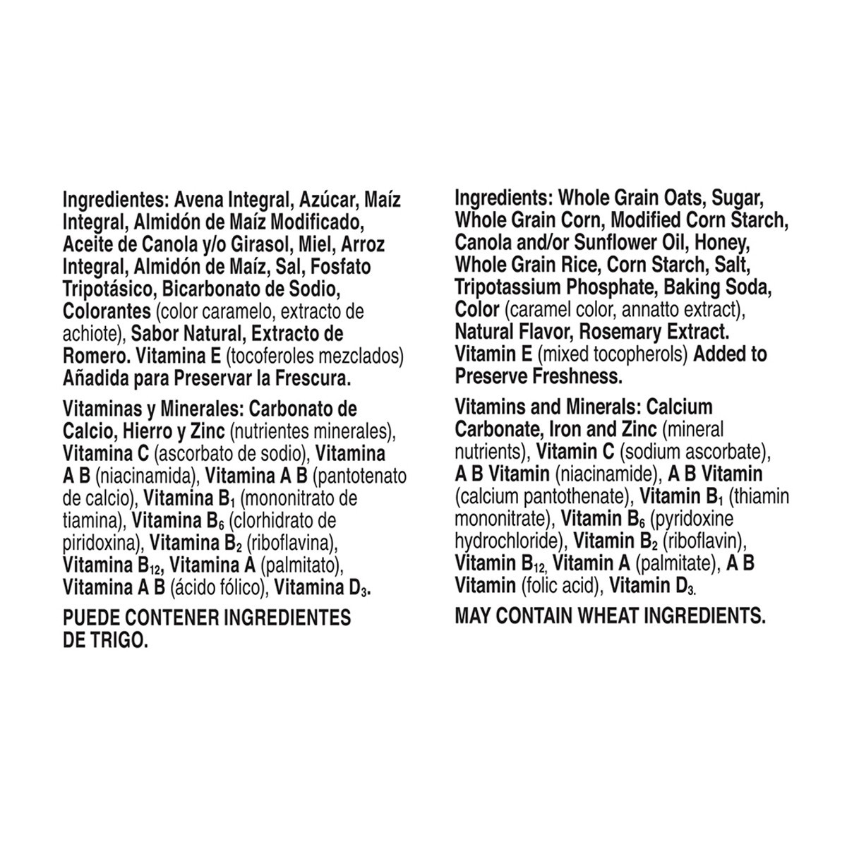 Whole Grain Oats, Sugar, Whole Grain Corn, Modified Corn Starch, Canola and/or Sunflower Oil, Honey, Whole Grain Rice, Corn Starch, Salt, Tripotassium Phosphate, Baking Soda, Color (Caramel Color, Ann…