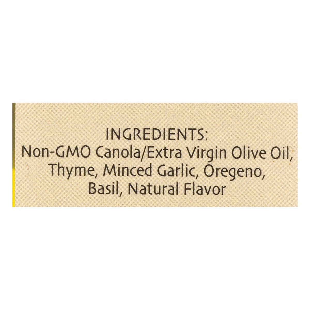 Non-GMO Canola/Extra Virgin Olive Oil, Thyme, Minced Garlic, Oregano, Basil, Natural Flavor.