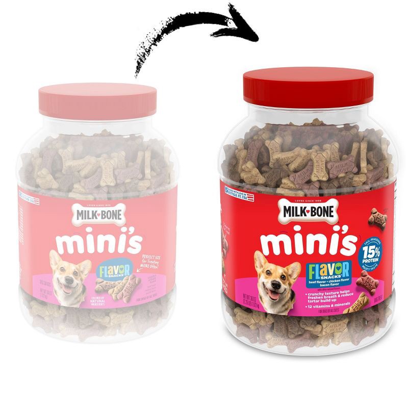 - CONTAINS: One 36-oz. canister of Milk-Bone Flavor Snacks Mini's dog biscuits for dogs of all sizes