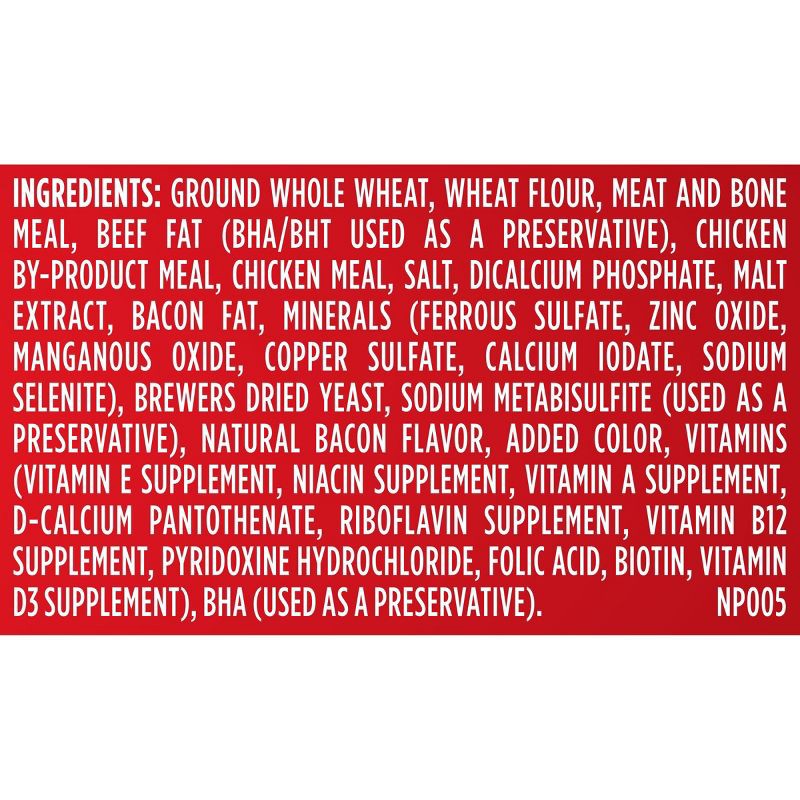 GROUND WHOLE WHEAT, WHEAT FLOUR, MEAT AND BONE MEAL, BEEF FAT (PRESERVED WITH BHA/BHT), POULTRY BY-PRODUCT MEAL, CHICKEN MEAL SALT, BACON FAT, DICALCIUM PHOSPHATE, BREWERS DRIED YEAST, MALTED BARLEY F…