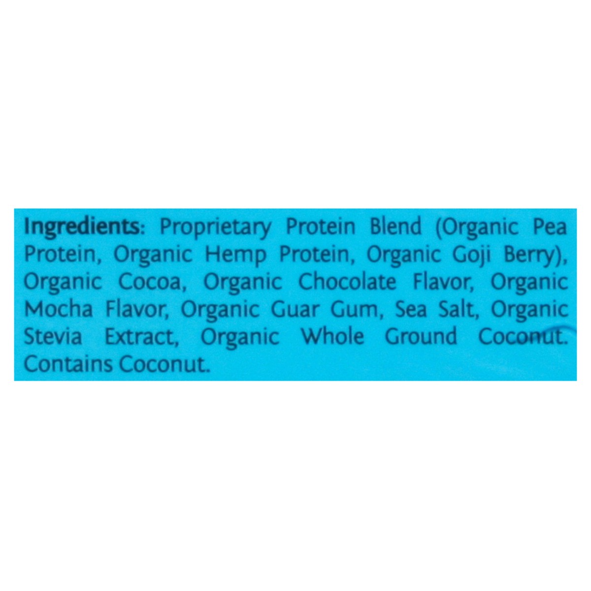Proprietary Protein Blend (Organic Pea Protein, Organic Hemp Protein, Organic Goji Berry),Organic Mocha Flavor, Organic Guar Gum, Sea Salt, Organic Stevia Extract, Organic Whole Ground Coconut.