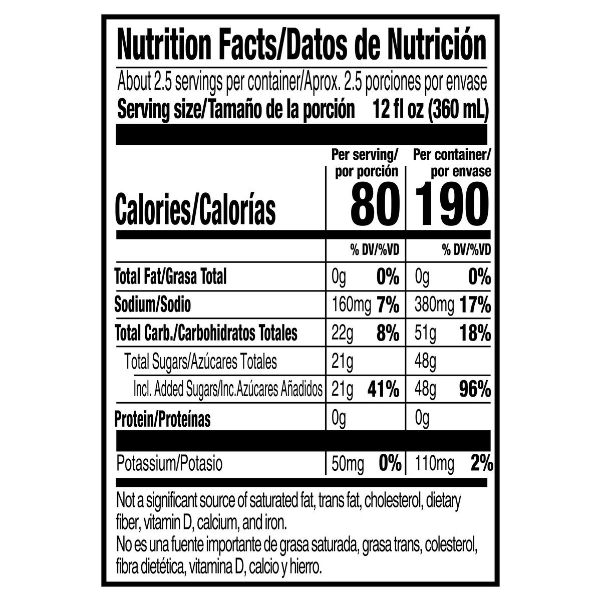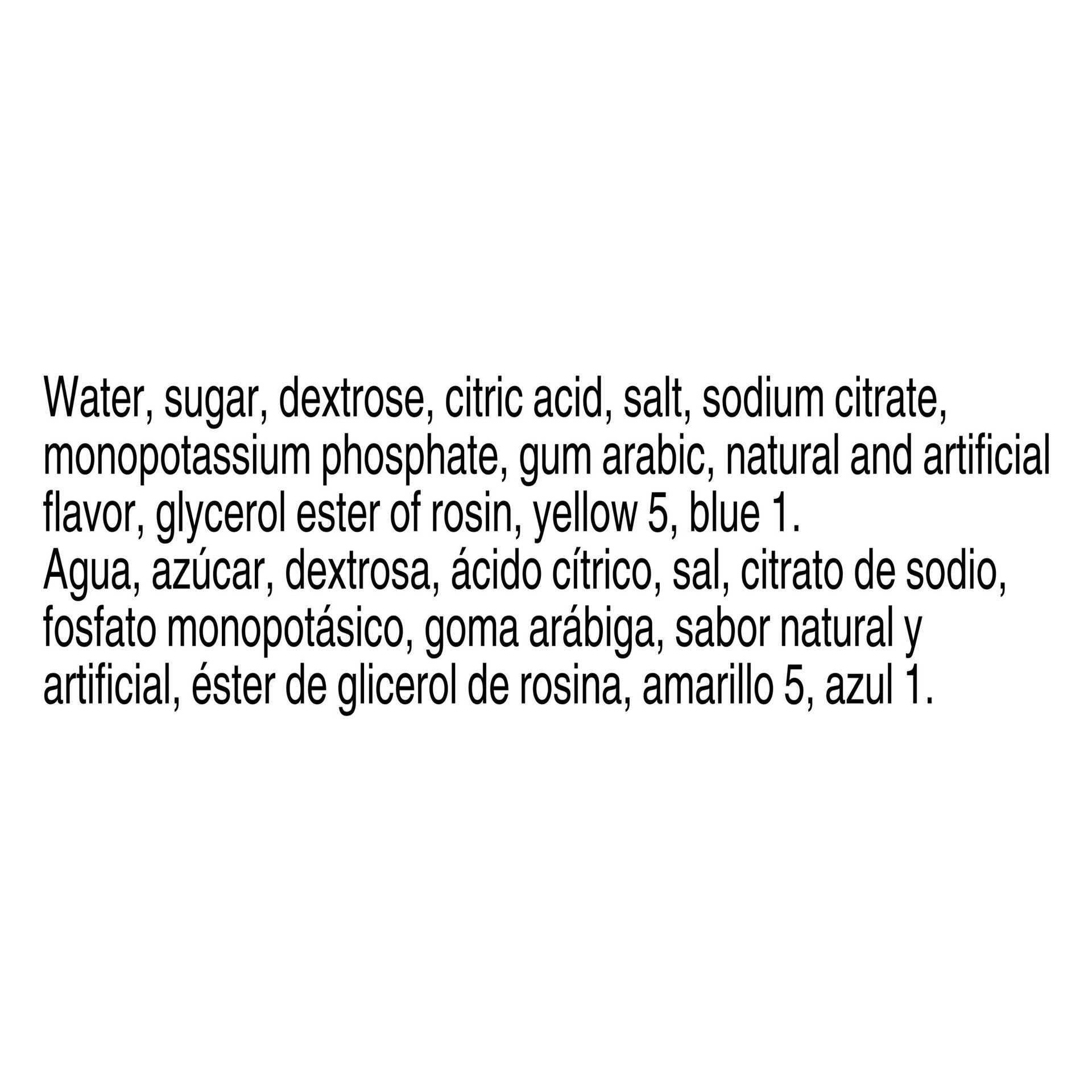 Water, Sugar, Dextrose, Citric Acid, Salt, Sodium Citrate, Monopotassium Phosphate, Gum Arabic, Natural And Artificial Flavor, Glycerol Ester Of Rosin, Yellow 5, Blue 1.