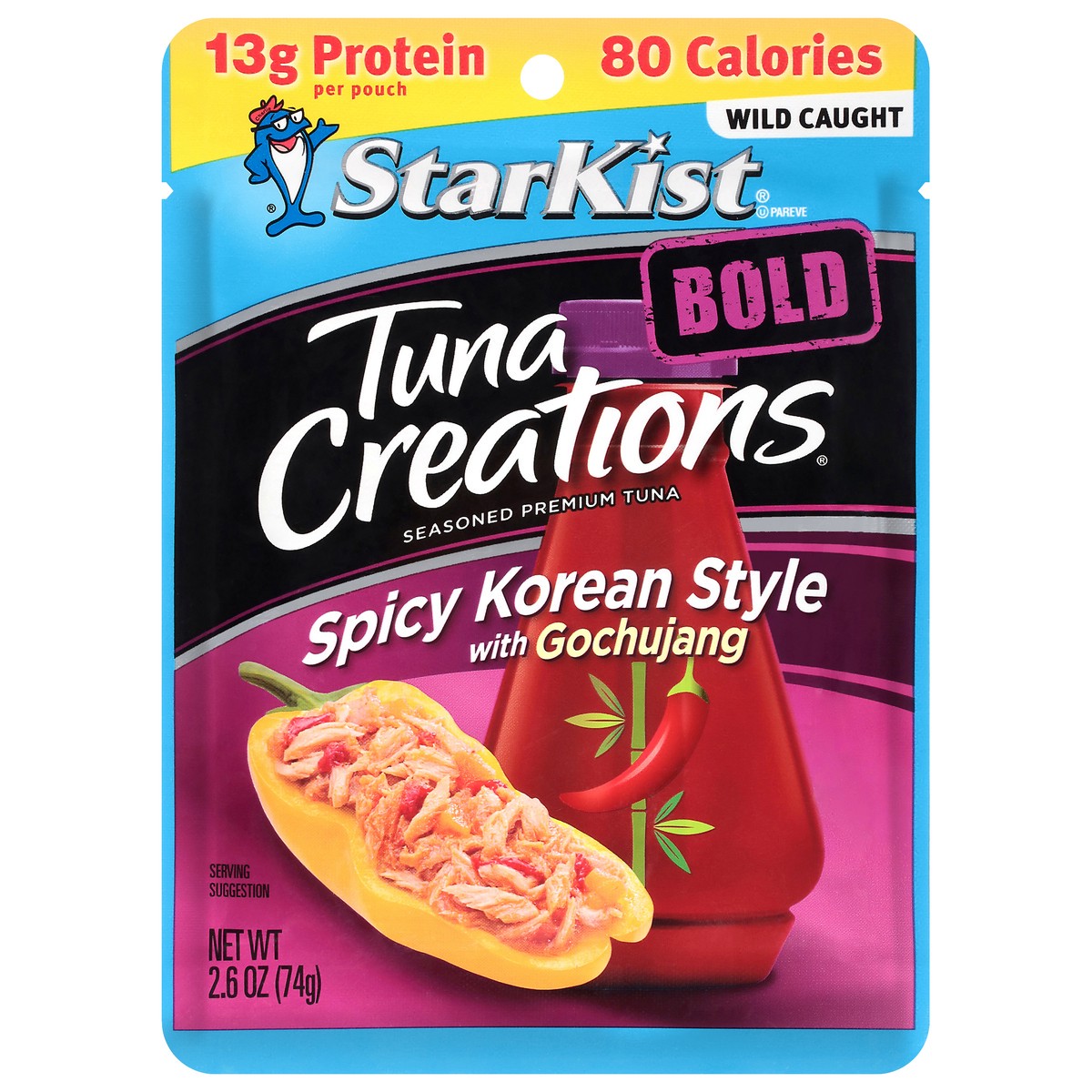 Lightly seasoned premium tuna. 80 calories per pouch; 13 g protein. Wild caught. Tear. Eat. Go. Flavor fresh pouch. Dolphin safe. Omega 3s. Spicy Korean Style. In the mood to feed your fiery side? We …