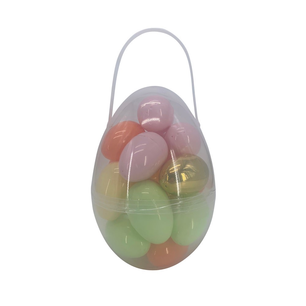 Holiday Home 18 ct Fill egg includes 17 warm pastel plastic eggs and a single metallic gold egg in a large egg container.Made in ChinaFour assorted colors and one metallic gold eggThree inch eggsMade …