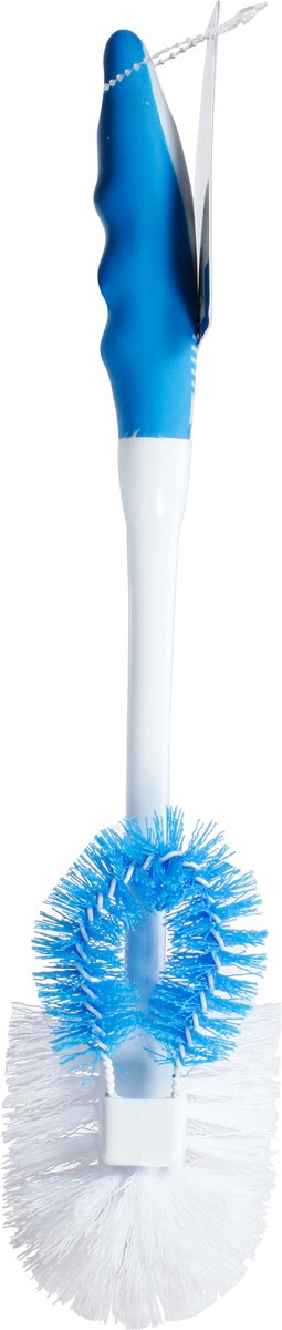 With toilet rim brush. Get rid of tough stains! Clean hard to reach areas. Durable. Stain and odor resistant. Ergonomic handle is comfortable and easy to use.