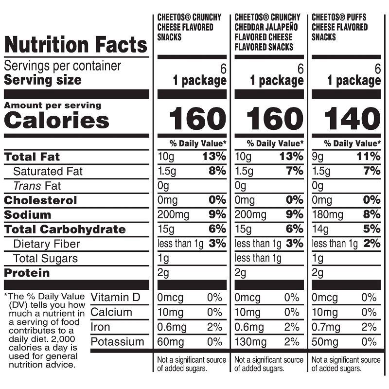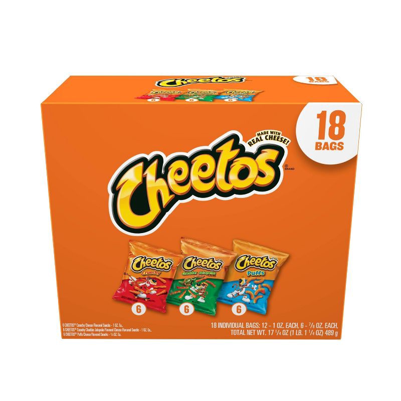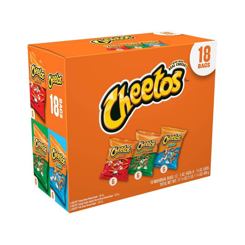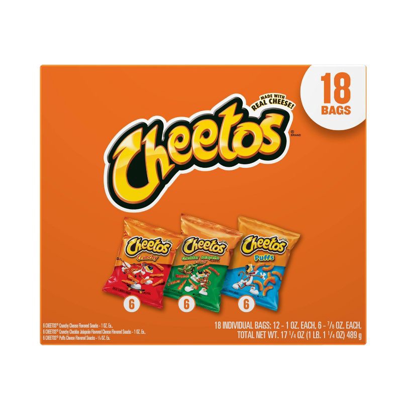 - Includes 18 single serve bags of Cheetos: (6) Cheetos Crunchy, (6) Cheetos Cheddar Jalapeno, and (6) Cheetos Puffs