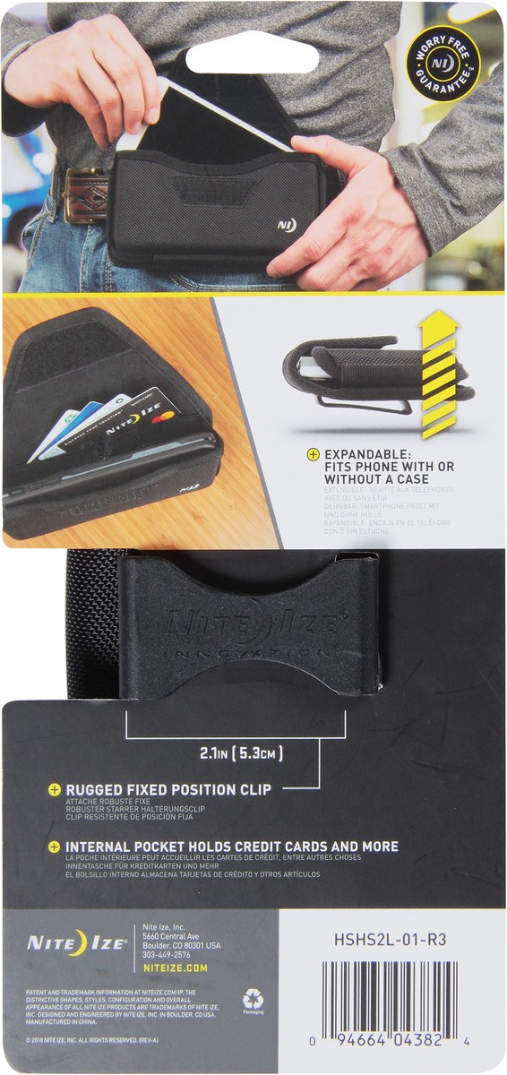 Expandable: fits phone with or without a case. Rugged fixed position clip. Internal pocket holds credit cards and more.