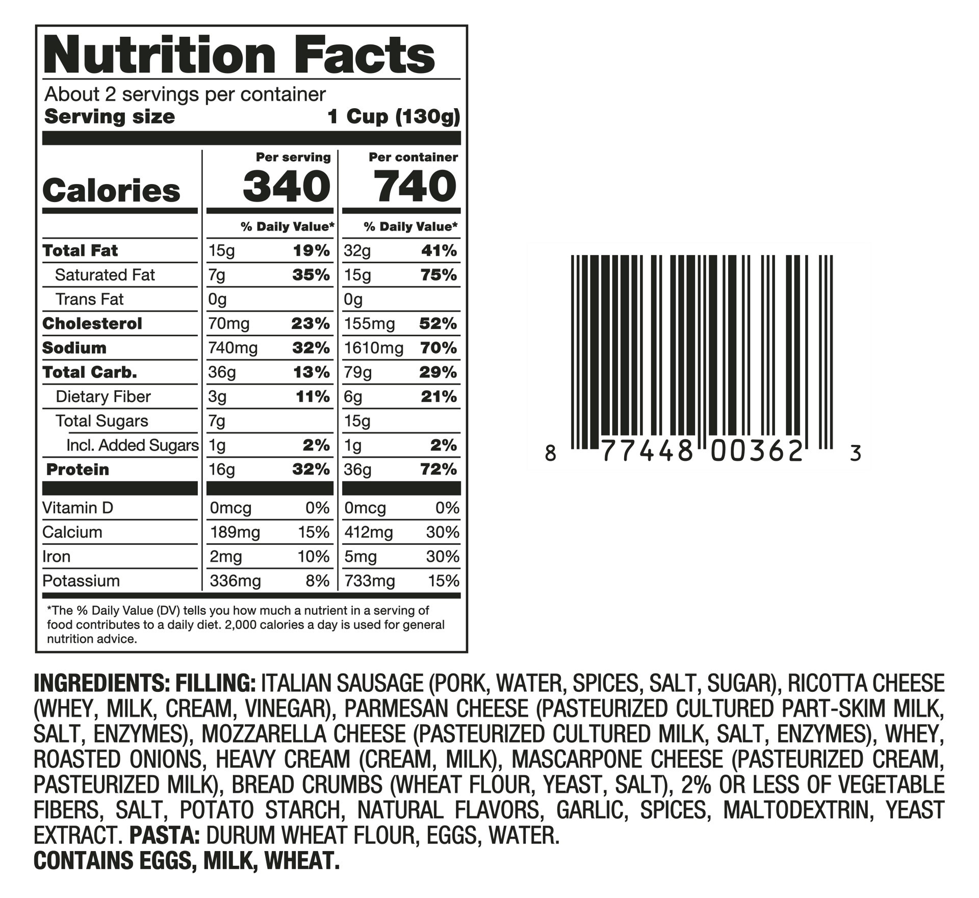 FILLING: ITALIAN SAUSAGE (PORK, WATER, SPICES, SALT, SUGAR), RICOTTA CHEESE (WHEY, MILK, CREAM, VINEGAR), PARMESAN CHEESE (PASTEURIZED CULTURED PART-SKIM MILK, SALT, ENZYMES), MOZZARELLA CHEESE (PASTE…